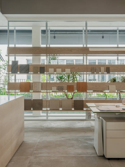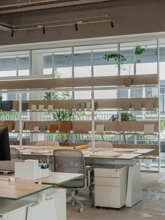 From the architect. Say Architects' new office has settled in the second phase of Shanghai Shangsheng New Institute, a collaborative office space opened with Luximorph. Say hopes to integrate the design background of Shangsheng New Institute into the space, creating an open garden full of freedom and vitality, and exploring various possibilities of design. The whole office is located on the south side of the second floor of Shangsheng New Institute, and rows of glass french window bring sufficient sunlight. The community's corridors are covered in greenery all the way, spreading all the way indoors. The entrance is divided into a miniature garden showcase by a continuous display wall of materials, which also serves as a blocking wall for the entire office area.