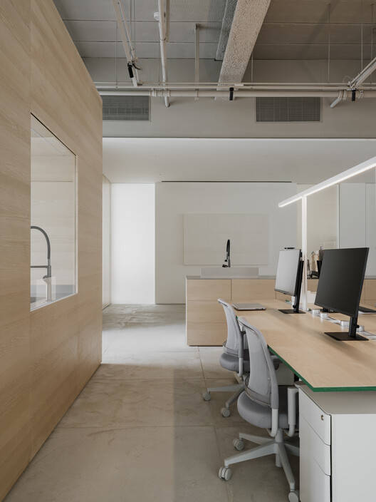 推门入内,开放办公区安置于中央,公共空间则呈L型,将办公区域围合,沿着公区的路线向内参观,即是提供招待的水景区与会客室,长条的一字型岛台作为二者之间的软隔断,自然分离出动静两条功能路线。