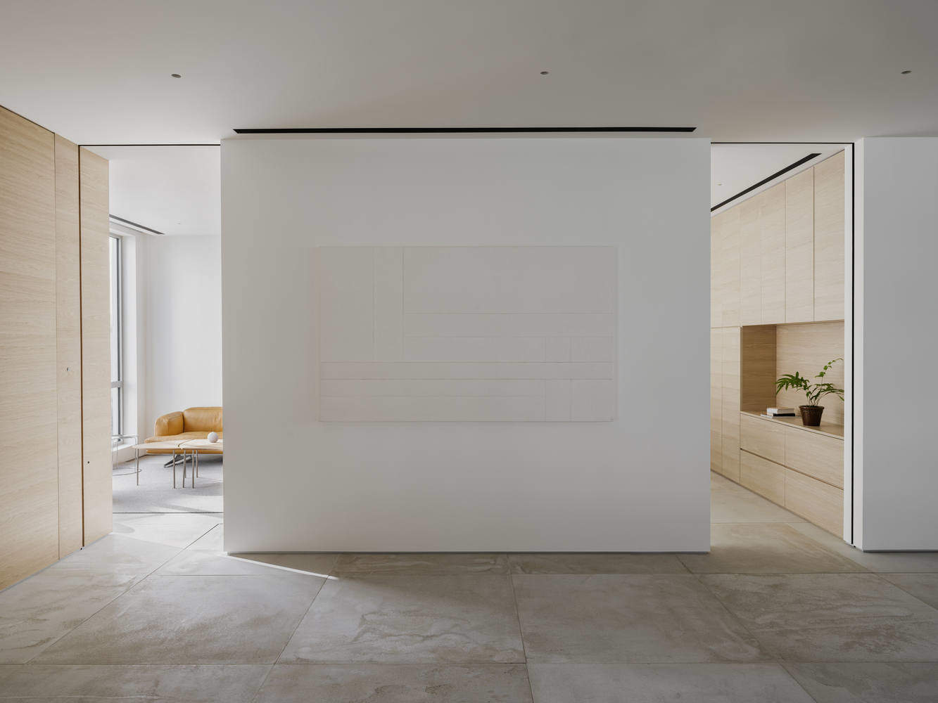 动态的公共区域承载会客与展陈两个功能,逐渐向内,装饰与色彩趋于平和,贴合展厅的设计氛围。中庭留白的墙面与过道,带来艺术性的沉默与停顿,将嘈杂与纷扰削减,短暂的缓冲过后,拉开门帘,是隐秘而舒适的会客室。