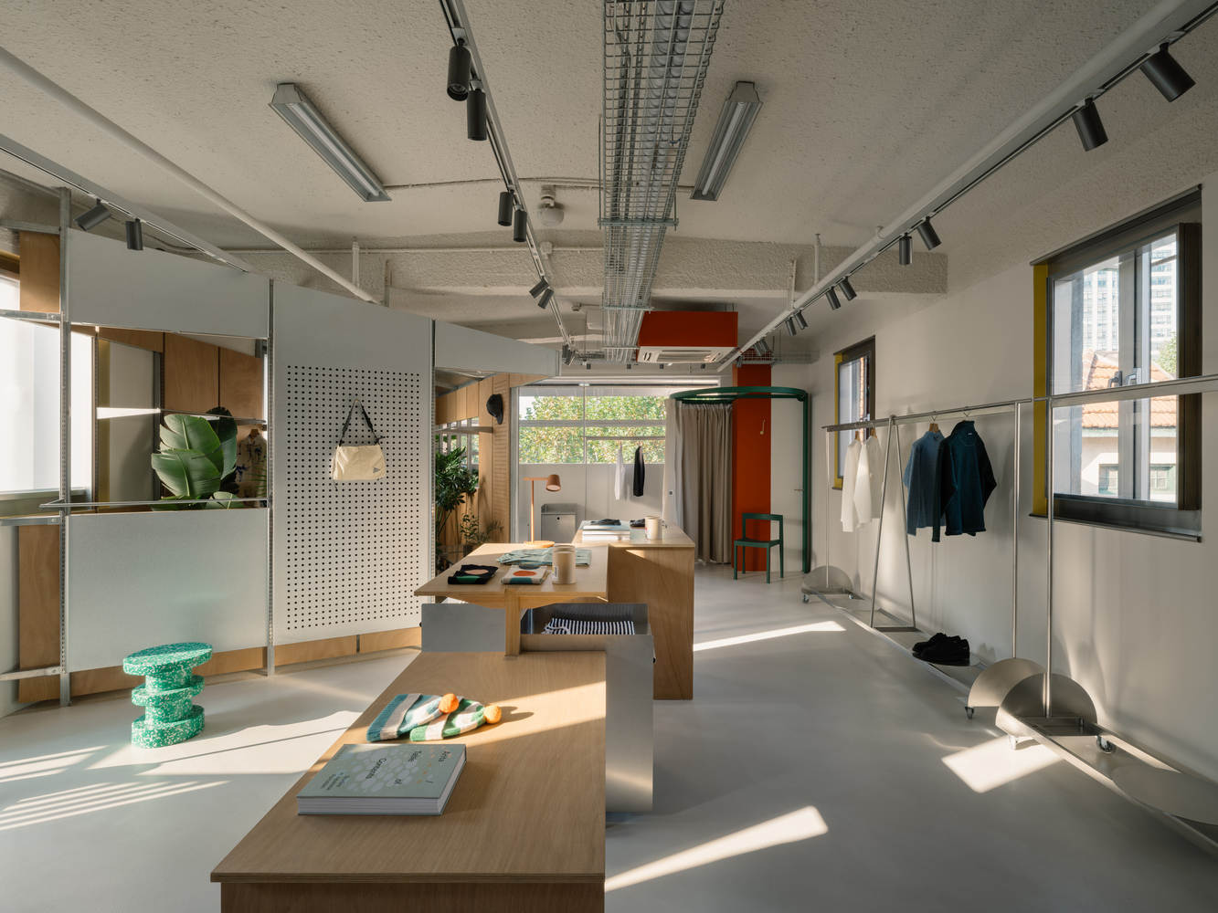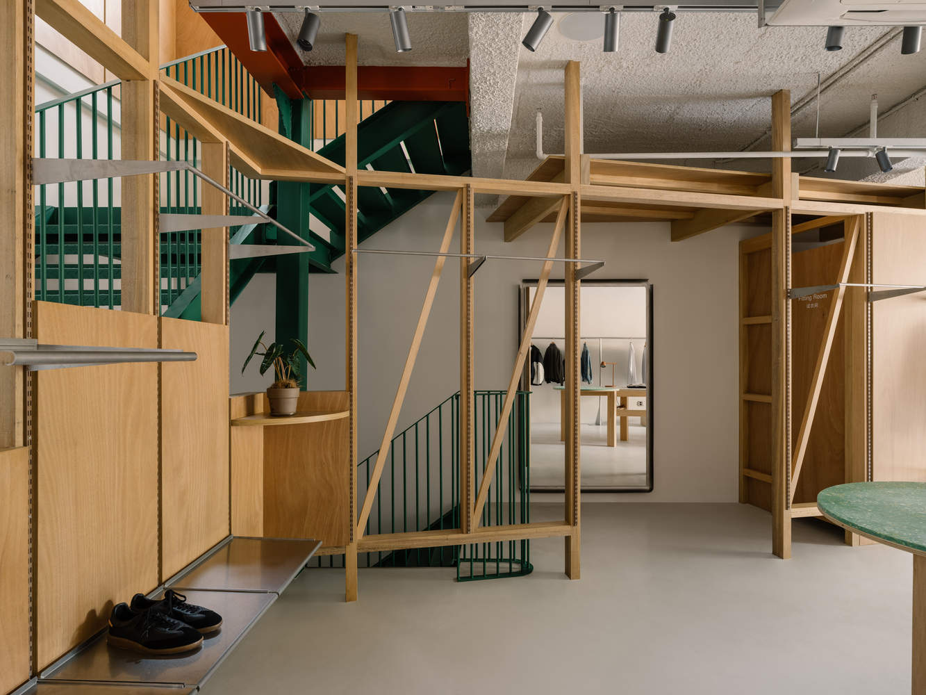 在各层的矩形空间里,我们加入了精准控制的斜线和折线,形成实木框架或者金属棚子,去打破单一形体的乏味,加强了空间的不稳定感。实木框架绕过绿色的楼梯,折线背后是更衣间和储藏室或收银台,正面是相同模数的衣架和木板,可以灵活调整陈列组合,并与另一边的墙面是纤细的不锈钢衣杆形成对比。根据每一层的品牌定位都有所不同,一楼的设计简单利落对应其城市风格的服饰品牌;二楼加入更多的材料拼贴,适合更中性多样的选择;到了三楼,房间洒满阳光,户外系列的服装在绿色植物映衬下,陈列在金属棚子中。上上下下楼梯,可以透过木框架纵向体验连续的每个楼层的场景中,多种材料和色彩标记的建筑元素组合,行走中充满动态。