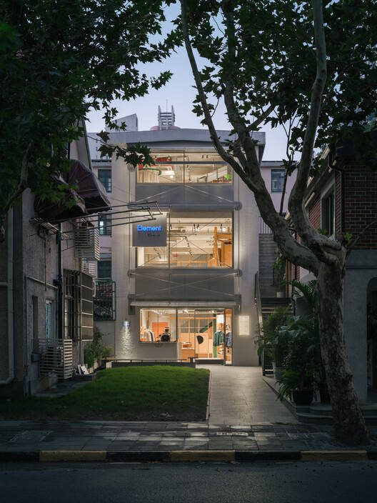 愚园路 1381-1 号并不临街;从人来人往的主街面后撤 30 米,让出了门前的一片小空地。作为几年来备受关注的服装买手店element的场址,这个并不起眼的独栋三层小楼为周围鳞次栉比的房屋包围着,退在深处,只露出一个可见的建筑正立面。在热闹的街区中显得安静内敛,但也不免容易被忽略。基于对城市界面的观测,以及对建筑本身进行的细致考察和信息提取,tao+c 西涛设计工作室将 element 愚园路店进行了全面的改造设计。