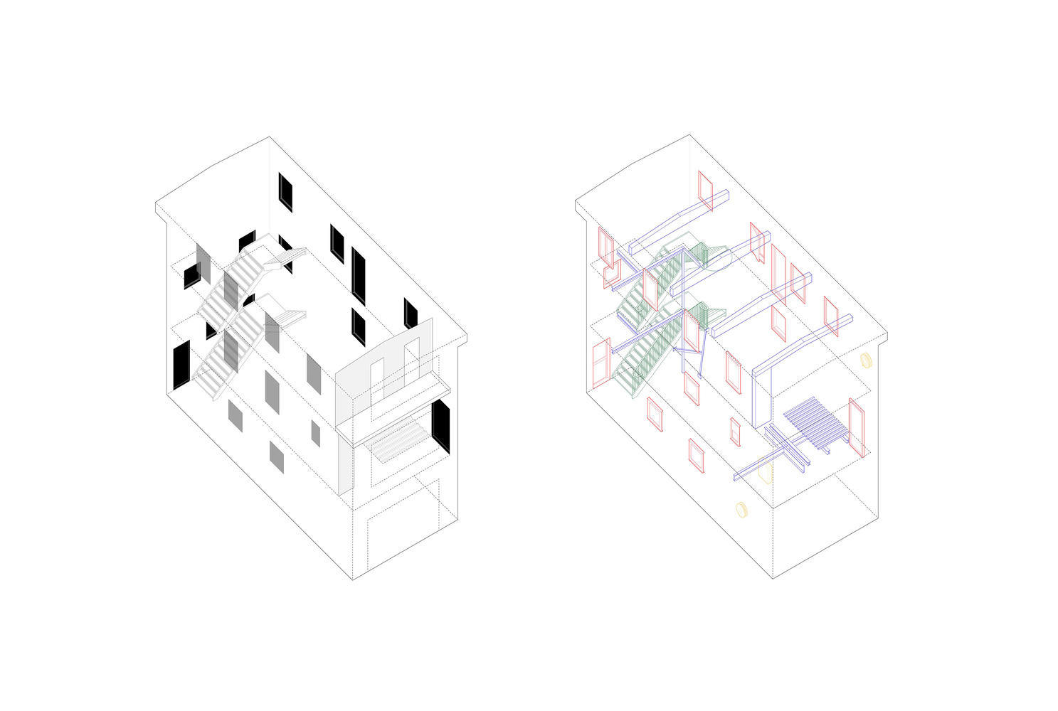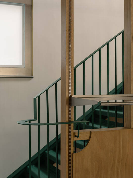 以前的几次改动中加入的钢梁,粗糙的逃生门,空调机器、消防栓,用不同的色彩标记组合;恢复被封掉的窗户,涂以黄色和加上可以开合的金属窗板,让人重新意识到这个建筑的特征,并察觉时间的痕迹。原有的简易逃生钢楼梯也被保留和揭露出来,刷成绿色,添加了栏杆和扶手细节。