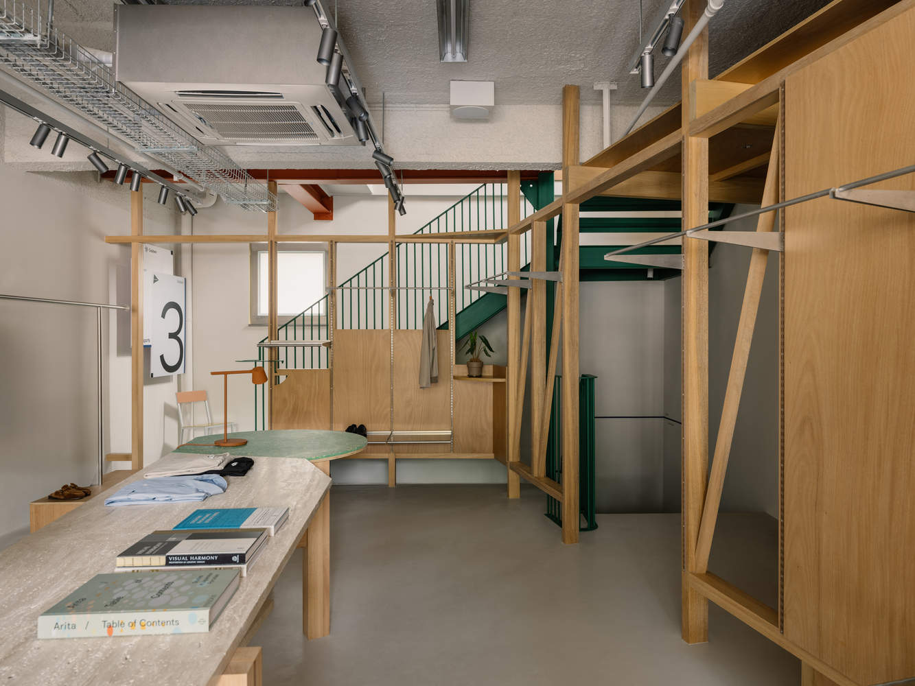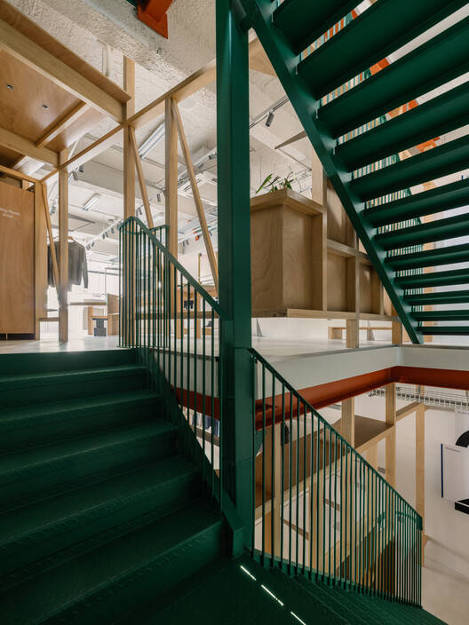 In the rectangular spaces on each floor, we have added precisely controlled diagonal and fold lines to form solid wood frames or metal sheds, breaking the monotony of a single form and enhancing the sense of instability in the space.. The solid wood frame wraps around the green staircase, with changing rooms and storage rooms or cash registers behind the folded lines, and hangers and wooden boards of the same module on the front, allowing for flexible adjustment of display combinations and contrasting with the slender stainless steel clothing poles on the other side of the wall. According to the brand positioning of each floor, the design of the first floor is simple and neat, corresponding to the clothing brand of its urban style; Add more material collages on the second floor, suitable for more neutral and diverse choices; On the third floor, the room was bathed in sunlight, and the outdoor clothing collection was displayed in a metal shed against the backdrop of green plants. Going up and down stairs, one can experience the continuous scene of each floor vertically through the wooden frame, with a combination of various materials and color coded architectural elements, making walking full of dynamics.