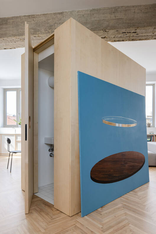 The movable staircase, long 'kitchen unit', and sofas in different positions add flexibility to the apartment. The interior itself adopts visually isolated furniture, highlighting the cleanliness and diversity of the space. Neutral toned materials, such as white wall paint, exposed concrete drainage ditches, birch plywood, oak flooring with mortise and tenon joints, stainless steel surfaces, white and black furniture, and striking blue on stairs, together form the background of the painting collection.