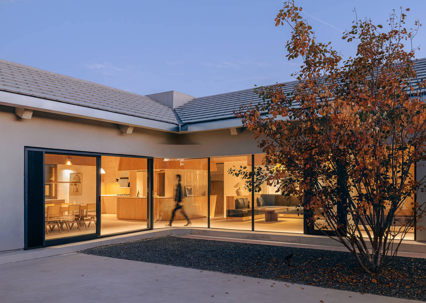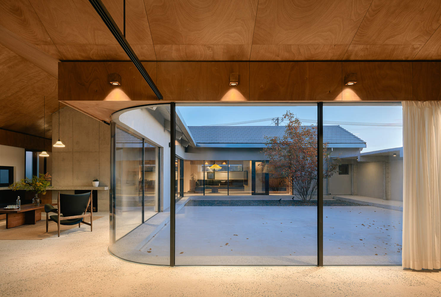 十字交叉与内外空间互动:“十字交叉”的独特平面布局是该项目的一大亮点。这种布局打破了传统院落的封闭性,通过不同方向房屋的相互连接,创造了穿透式的视野,使得室内外空间得以互动。这种设计手法不仅增加了空间的通透感,还赋予了居住者多维度的体验。各功能区域的独立设置,也为不同家庭成员提供了私密空间,同时又能保证相互间的互动。这种巧妙的布局,使得有限的空间在视觉上更加开阔,生活场景也得以层叠展现,体现了设计师对空间组织和居住体验的深刻思考。此外,外墙结构向屋脊方向移动,并采用幕墙设计,进一步强化了内外空间的融合,增强了建筑的整体感和通透性。