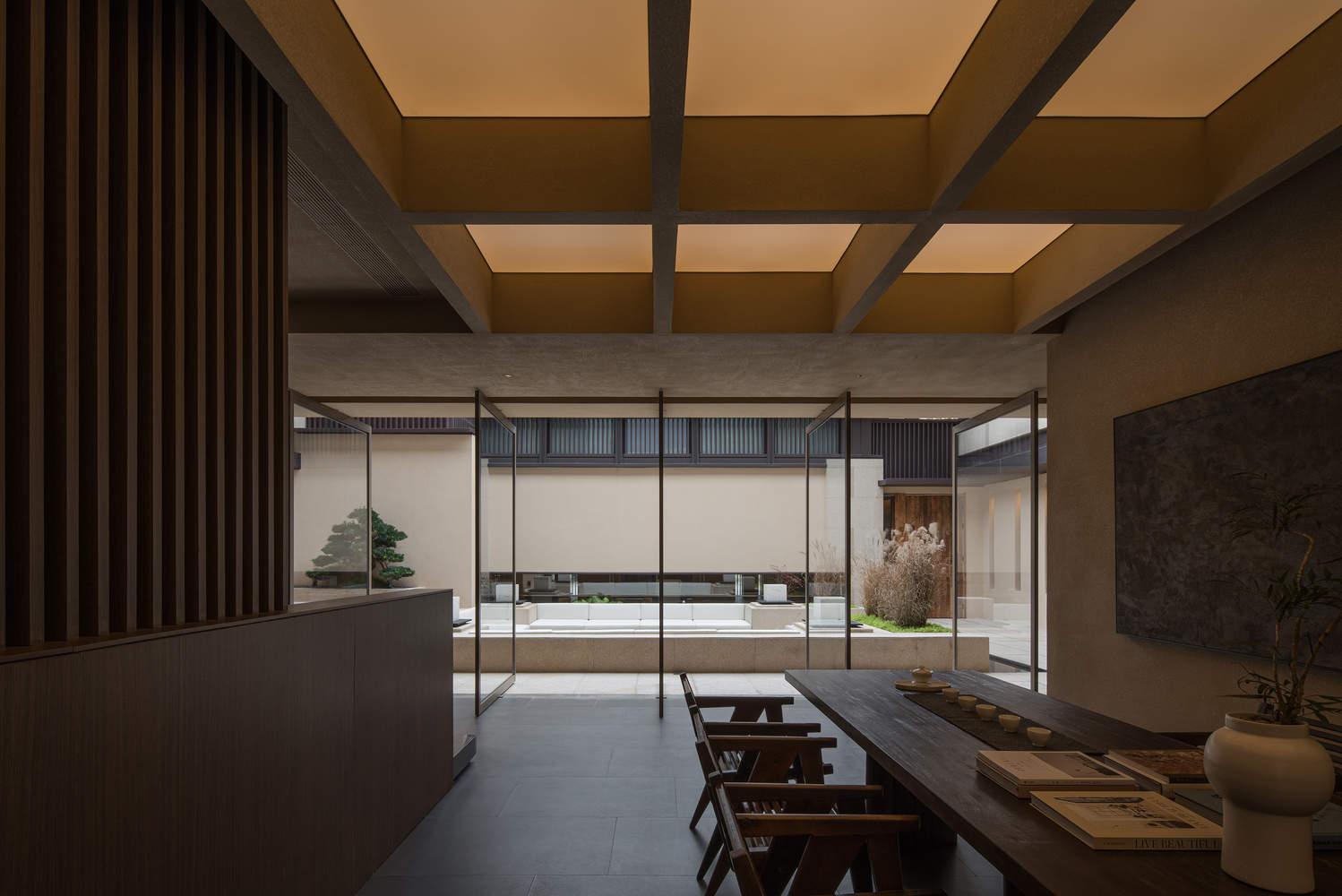 室内设计延续在地性的当代化表达,材质选择上克制而丰沛:陈旧的木材、原石、黑釉陶瓷和手工染色的亚麻布作为媒介,反映出该地区工艺的触觉美感。夯土质感唤起黄土高原的记忆,而竹编图案则捕捉了光影的瞬息变化。每一种材质皆为文化的承载体,共同构建出一个安静、有气韵的栖居场所。