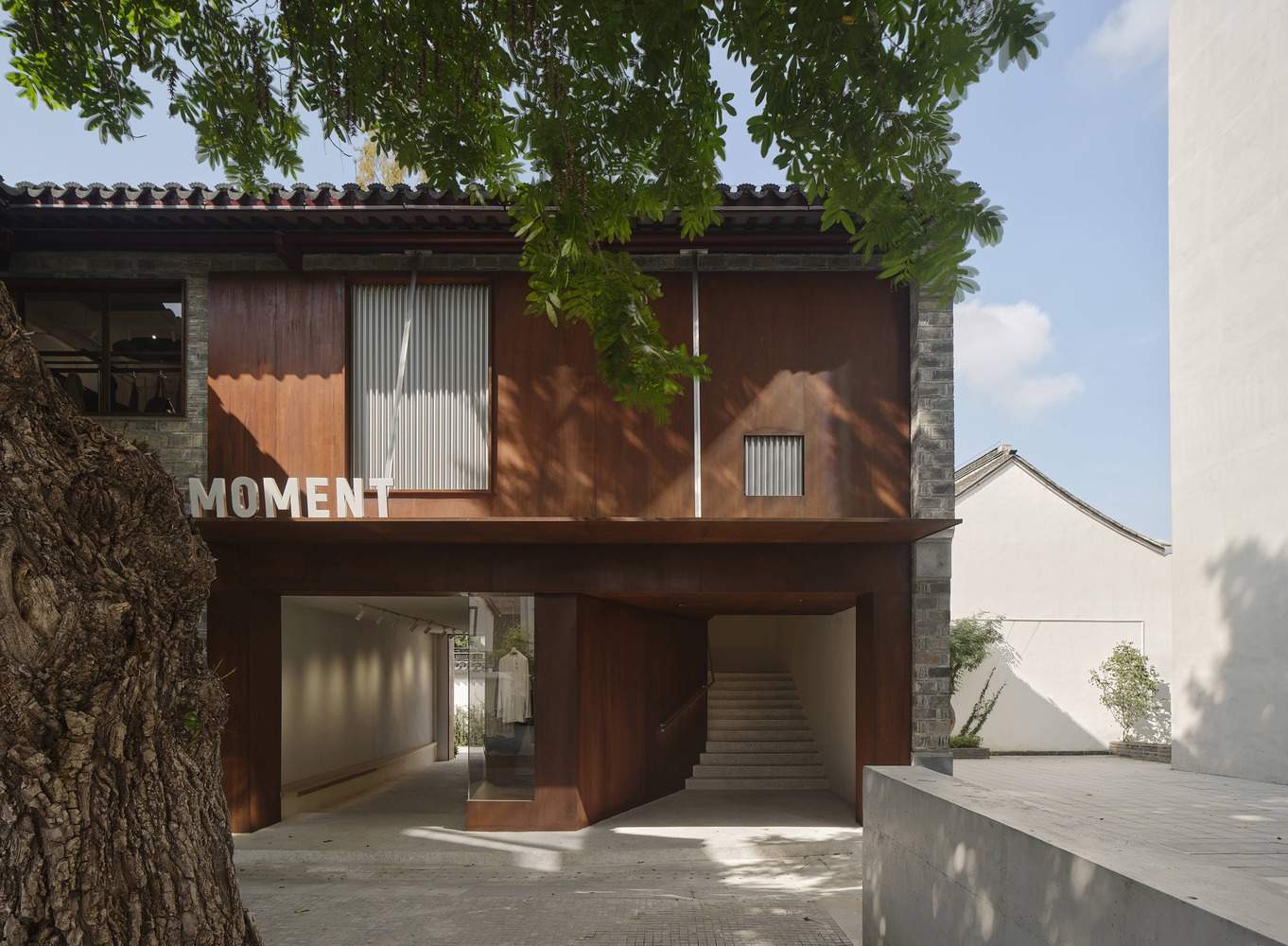 Moment所在建筑的一层商铺被分割出租,其中大部分区域被消防楼梯占用,剩余的可用空间宽度仅为3.5米。相比室内的局促,室外空间更具亮点。被建筑藏于身后的庭院内,高耸的枣树枝繁叶茂,浓密的树影斑驳洒落在地面上,隐于熙攘街巷的景致静谧而美好。因此我们建议业主,与其将一层仅有的狭小空间设计成局促的售卖区,不如将其开放为室外空间,形成一条连接内院与街道的过廊。内院的景观直接呈现在街面上,吸引着行人驻足徘徊。步入其中,正如《桃花源记》所描述的那样:“初极狭,才通人,复行数十步,豁然开朗。”这使得狭小的店面获得更多视觉延伸,也为顾客带来如同进入“世外桃源”的体验。针对仿古建筑的商铺改造这一主题,需要为立面找寻到了一种既能保留老屋风貌,又能突出商铺品牌形象的介入方式。设计采用了一种类似欧洲古建筑修复与再利用的策略,通过现代化的窗框和开窗方式,为建筑带来新的生命与视野。窗构件材料选择了耐候钢,其表面的斑驳锈迹蕴含着一种时间感,与立面青砖的调性隐隐契合。同时,醒目的颜色和工业制品的平整度都与砖墙有所区分,能清晰地展现立面的新旧关系。二层正立面的窗洞维持在原有的位置,其尺寸被扩大成落地窗使室内更多地被看见。西南面山墙上的窗装饰有飞檐,通过钢板的织补将转角两侧的窗形成一个完整的、虚实相间的角窗。