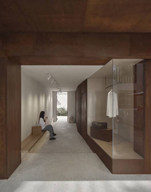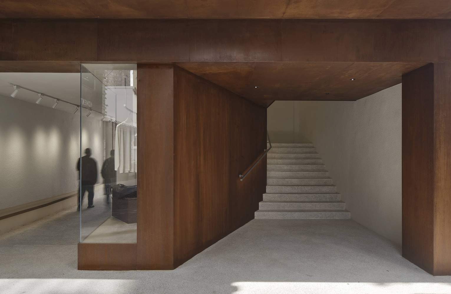 Inside the courtyard, the facades of the buildings on both sides continue the design language of one side of the street, and due to no longer being limited by the continuity of the street, the facades have greater freedom for renovation. Therefore, the scale of the intervening components was expanded from windows to facades, completely emptying the interior of the original "ancient building" and fitting it into a metal sculpture. The exterior wall of the fire escape staircase has been completely removed and converted into the main entrance of the store. Connected to the corridor, the ground floor of the building presents a complete large-span opening. The window display is interspersed in the center, dividing the opening into two.
