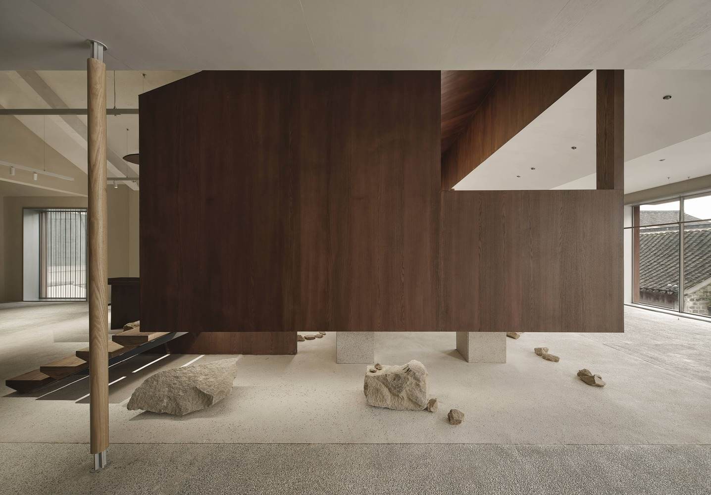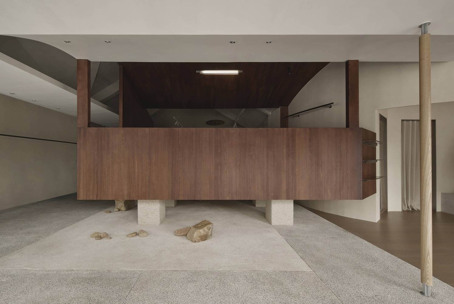 利用坡屋顶带来的高度优势,在平面转角位置盖起一座单坡面木亭,作为业主接待常客友人的休憩区。木亭内部布置如一间茶室,围绕长案设有卡座沙发和几张小椅。木亭正面与背面完全打开,保持了视觉上的通透感。木亭底部由四根矮方柱垫起,整体抬高75公分,由一段悬浮楼梯与地面相连。下方地面采用水洗石,与散落布置的石块共同营造出一个虚构的户外地形。木亭的漂浮细腻与地面的粗粝相对,仿佛它原本不在此处而是从远方流浪而来,只是小作停留。L形转角处放置了一个圆柱体来削弱阳角的尖锐感。其内部分为试衣间和美甲服务区。圆柱体延伸至木亭内部,支撑木亭的山体,与屋顶形成的圆弧交线柔化了空间。木亭与圆柱空间成为空间中最核心的“会客厅”场域,定期邀请核心顾客参与沙龙、分享会或新品试穿会,通过这些互动来增强顾客与品牌之间的黏性。