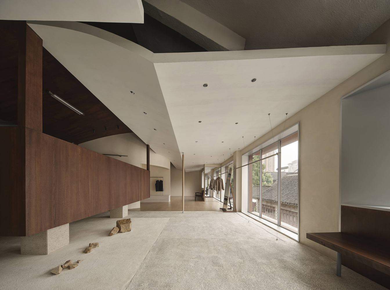 Clothing display also requires a more immersive experience. Attempt to transform the sales space into an exhibition full of storytelling, emotional resonance, and experiential value. By introducing the concept of "corridor" in traditional gardens, a flowing and narrative style tour route has been designed for customers. The clothing display slowly unfolds around the "reception room". The ceiling corresponding to the path slightly tilts upwards, forming a natural "corridor" space underneath. The stretching curve of the ceiling brings contemporary beauty to the space, while also echoing the ridge curve of Gan Xi's former residence. The ceiling is actually fixed to the roof by hanging locks, with a slender, non structural column set at each end. They serve as a visual fulcrum to lift up the board, making the whole seem to float more lightly.