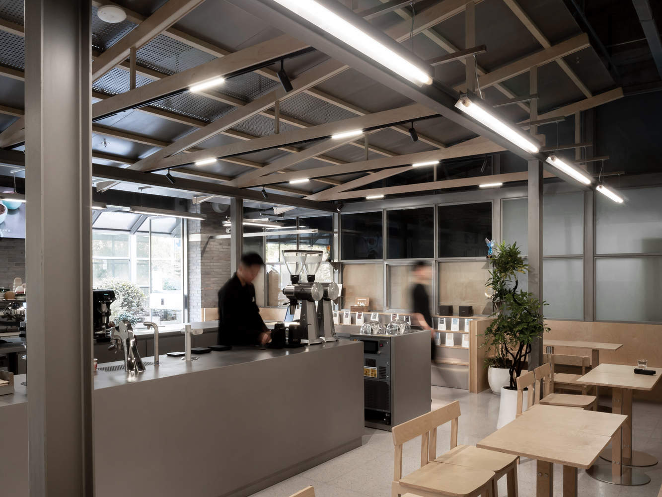 The first "pavilion" is about the venue, while the second "pavilion" focuses on the state between the barista and the guests. ”The enclosed bar in the pavilion divides the space under the eaves into two parts, one for the barista and the other for the guests. The centrally arranged circular bar counter belongs to the realm of baristas, which can be understood as a performance "stage" for baristas. It can operate and produce while maintaining sufficient dialogue with customers in a certain enclosed space. Outside the bar counter, the virtual space between the eaves of the "pavilion" and the four pillars under the eaves belongs to the guests, combining the sense of belonging still located under the pavilion with the experience of sitting around and watching the center of the stage.