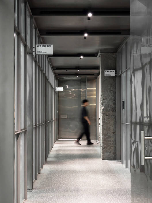 The original demand of the gallery owners was to completely separate the three main functions and make them independent of each other. In order to meet usage needs while reducing isolation, the design team wants to create a boundary that is as flexible and hierarchical as possible. So, the design team placed a semi transparent corridor between three functional zones, which not only separated the space and naturally became the boundary, but also connected these three areas together to form a buffer barrier, so that although the teaching area, office area, and coffee shop are separated in accessibility, they are visually perceived as a whole.