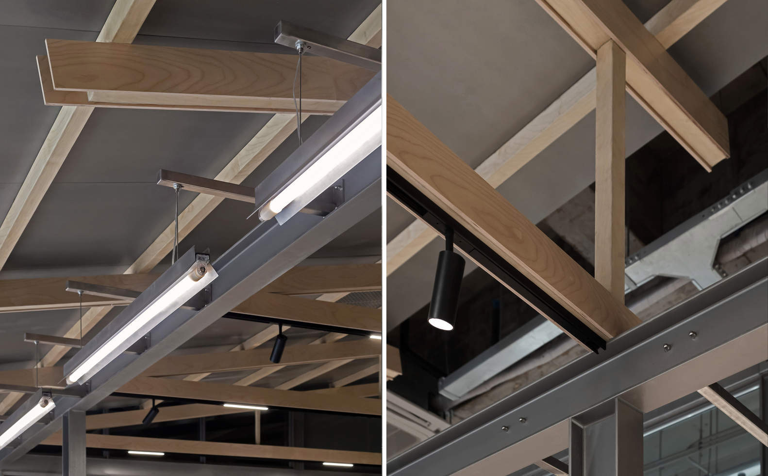 The details understood by the design team should serve the whole. The main structure of the pavilion, consisting of I-beams and steel columns, visually perceives the volume and weight of the space, and is also the structural foundation of all indoor elements. So the second level of details placed by the design team are attached to the main structural system - protruding along steel beams, columns, and trusses and suspended, forming lighting fixtures, seats, and storage racks. The socket and switch are also attached to the steel column in a parasitic manner.