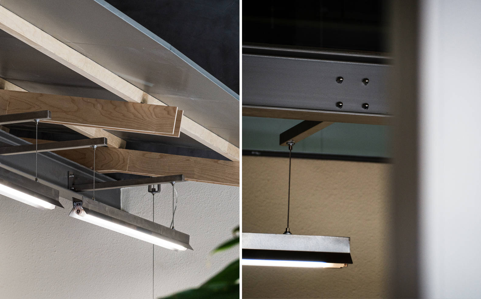设计团队所理解的细节,应该是服务于整体的。构成“亭”的主结构,工字钢梁和钢柱,在视觉上让人们感知到空间的体积和重量,同样也是构成一切室内元素的结构基础。所以设计团队置入的第二层级的细部是依附于主要构造系统的 —— 沿着钢梁、钢柱和桁架挑出再悬吊,形成了灯具,座椅和置物架。插座和开关也是以寄生的方式依附在钢柱上。