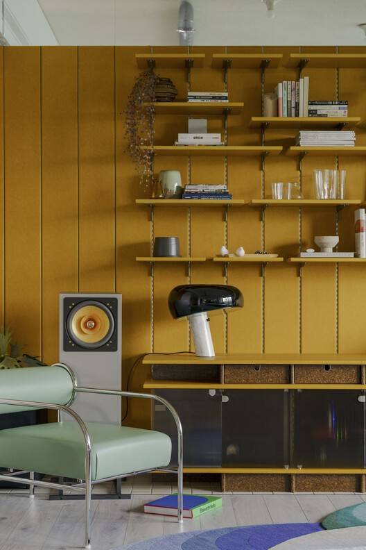 色彩与功能的巧妙融合: 项目在色彩运用上的精妙之处值得称赞。设计师并未盲目堆砌色彩,而是将黄色、蓝色、绿色作为主要点缀色,精准地服务于空间的功能划分。这些色彩被巧妙地应用于客厅、厨房和书房等不同区域,从而清晰地界定了空间的功能,并提升了空间的视觉层次感。此外,设计师还将色彩方案融入到空间框架、家具形式和布局策略中,营造出一种整体的和谐与平衡。这种对色彩的深度理解和细致运用,不仅美化了空间,更赋予了空间情感和活力,使之成为一个令人放松、充满乐趣的居住环境,真正实现了为高压生活提供“绿洲”的设计目标。