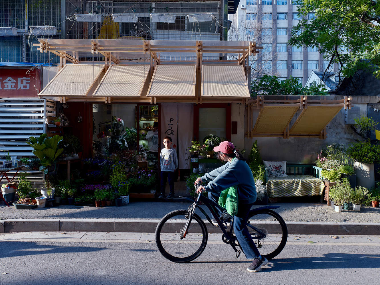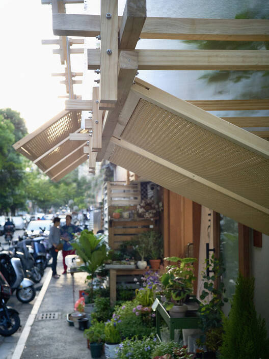 The eaves of the bamboo hat were used by ancient people to protect the pavilion from wind and rain, and to shield it from the scorching sun within ten miles; The hat is reminiscent of its function of providing shelter from rain and sun; The eaves are the main architectural form of this design. ——Li Yan is the name given by his friend Zhou Bo for his work. The design of the eaves of the hat originated from the invitation of her friend Yuan Hua, who took over a flower and plant shop. The storefront left by the previous owner already has a certain visual quality. The main demand for the new storefront is to block the strong summer sunlight for the flowers and plants placed outside; At the same time, a small corner can be created on one side of the wall for resting.