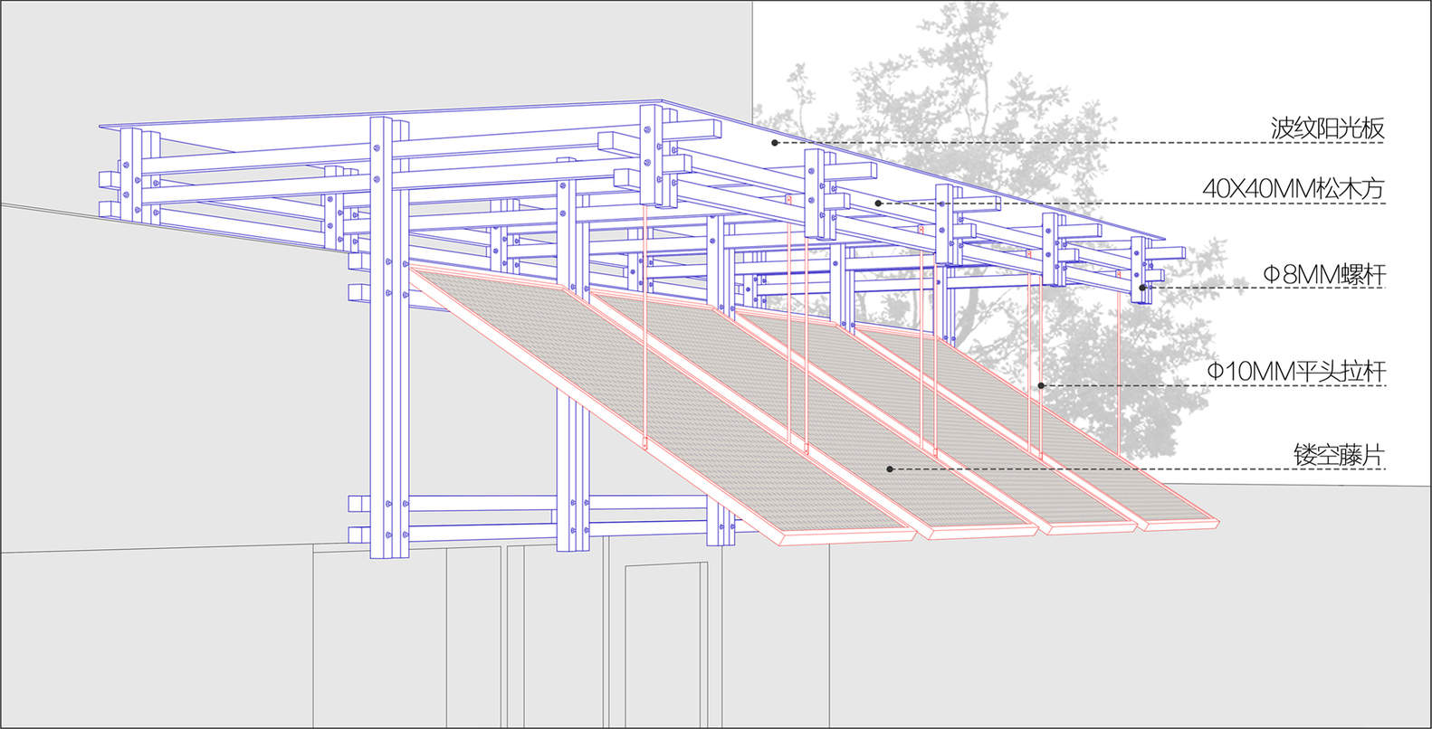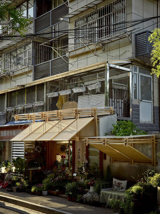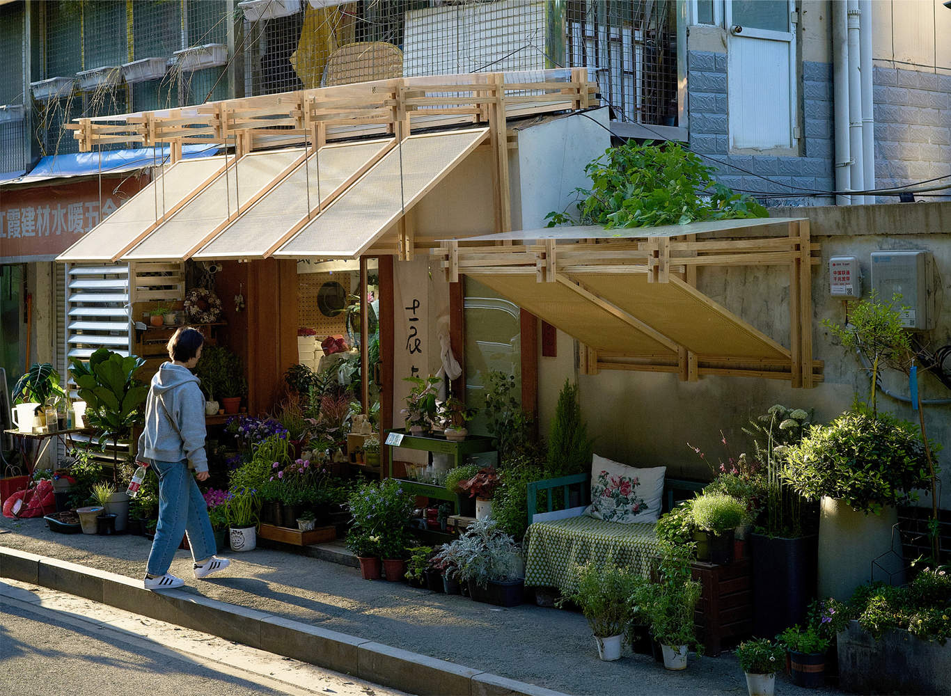 The concept of form originates from its functional demands: to stand out and provide shade. The flower planting shop was originally built using walls and residential courtyards on the ground floor, and the roof and facade do not have the load-bearing capacity for pasting. The direct response to the current situation is to cross the threshold of the status quo and take root from the bottom of the second floor balcony of the main residential building in the rear. After the overhang is completed at the top of the door, the sunshade surface naturally adopts a downward hanging method, and the logical form of the hat eaves is thus generated.