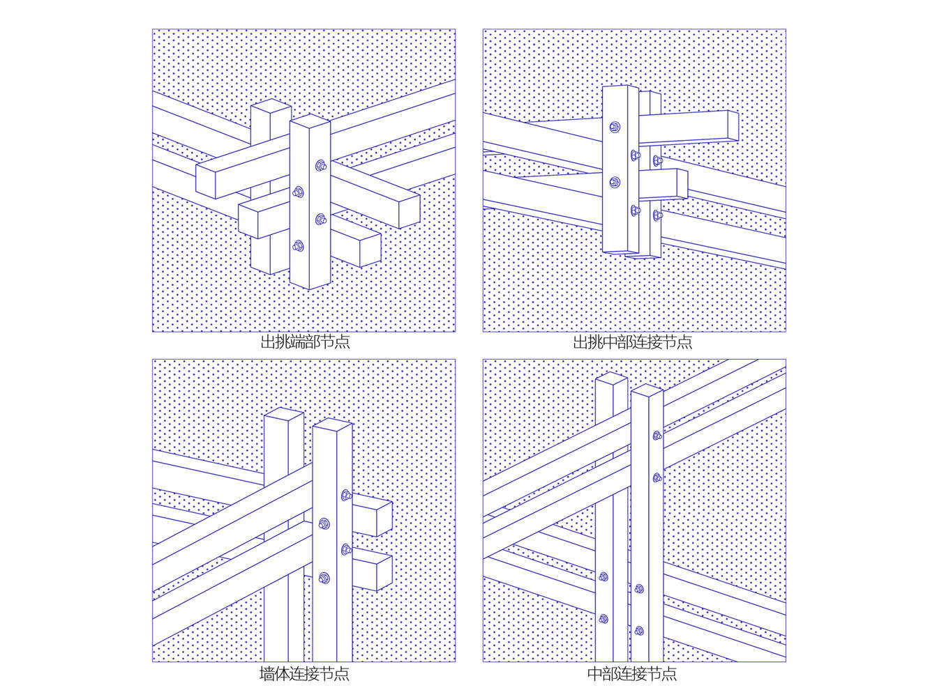 为实现快速自主搭建的目标,我们选择易于手工加工的木构方案。所有构件断面统一,选择市场上常见规格的方木,长度根据图纸由厂家切割完成,现场采用螺栓连接的方式组装。