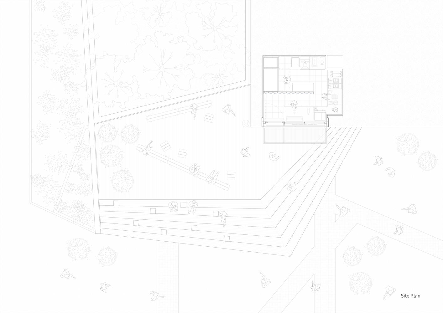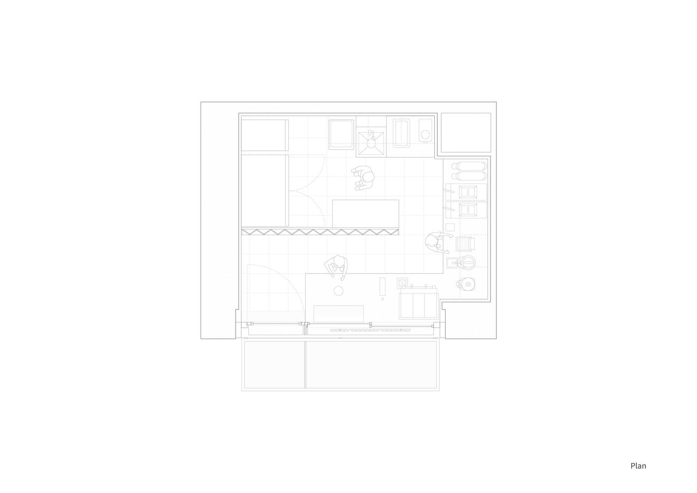 功能与社区的融合:除了出色的外观设计,该项目在功能性方面也表现出色。设计者并未将咖啡馆仅仅视为一个售卖饮品的场所,而是将其定位为社区的一部分。户外露台的设计,将咖啡馆的场所感延伸至社区,为顾客提供了社交和休闲的场所。这体现了设计者对城市肌理的深刻理解,以及对人与空间关系的思考。同时,平面图的呈现也展现了对空间布局的精心规划,包括对流线、功能区域的合理划分,使得咖啡馆成为一个既舒适又充满活力的场所,成为城市生活中一个令人愉悦的停靠点。