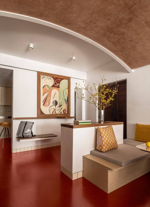 色彩与材质的创新运用:在色彩和材质的选择上,该项目大胆创新,展现了设计师的艺术审美和对空间氛围的精准把握。红色洒金地毯、绿色瓷砖、金色拱顶、绿色大理石咖啡桌、猩红色的窗帘等元素的运用,构建了一个充满活力和个性的居住空间。走廊空间对深红和普兰的大面积运用,更是营造出了一种抽象画般的视觉效果,赋予了狭窄空间独特的领域感。这种对色彩和材质的巧妙运用,不仅提升了空间的视觉冲击力,更重要的是,它通过营造不同的氛围,丰富了居住者的感官体验,使空间更具表现力和感染力。