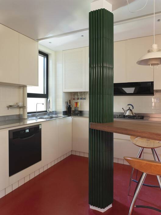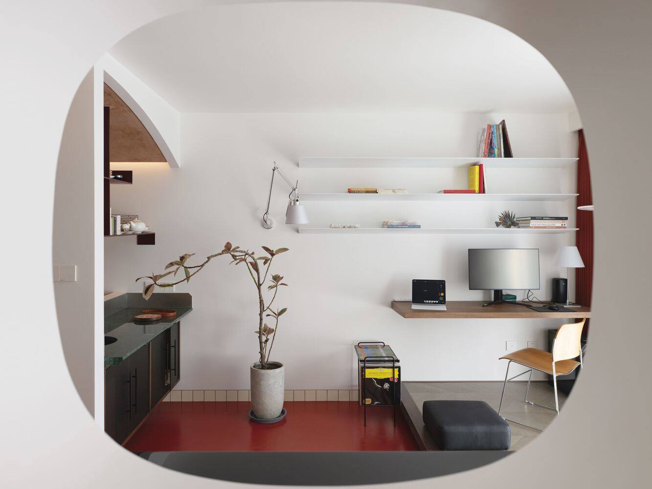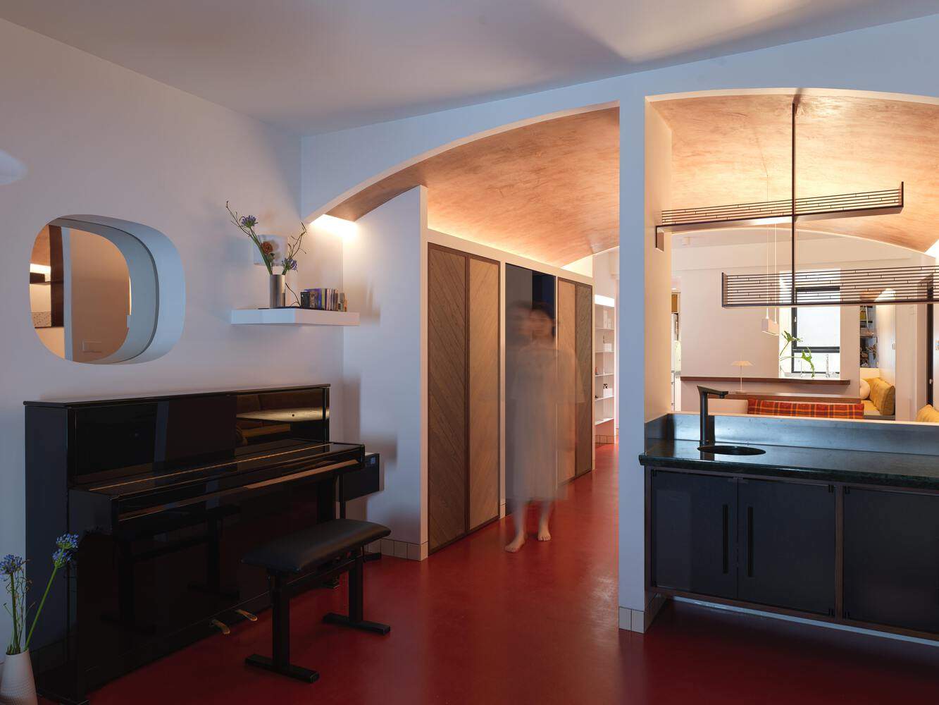 We made some bold attempts in terms of color. The floor is a red linen carpet sprinkled with gold, the curved tiles outside the hexagonal pillars of the kitchen are green, the dome is golden yellow, the coffee table on the south side of the family room is made of green marble, and the curtains are crimson. The blue double door facing the card seat leads to two bedrooms, which is the same size and shape as the lockers on both sides, bringing about dramatic space conversion. In this short corridor space, I used a large area of deep red and plain, including the tiles and baseboards in the washroom, and borrowed light from the frosted glass doors and cabinets in the bathroom and the gaps between the ceiling. When I closed it all around, I immediately found myself in an abstract painting. In this way, the narrow and dim negative space gained a sense of territory.