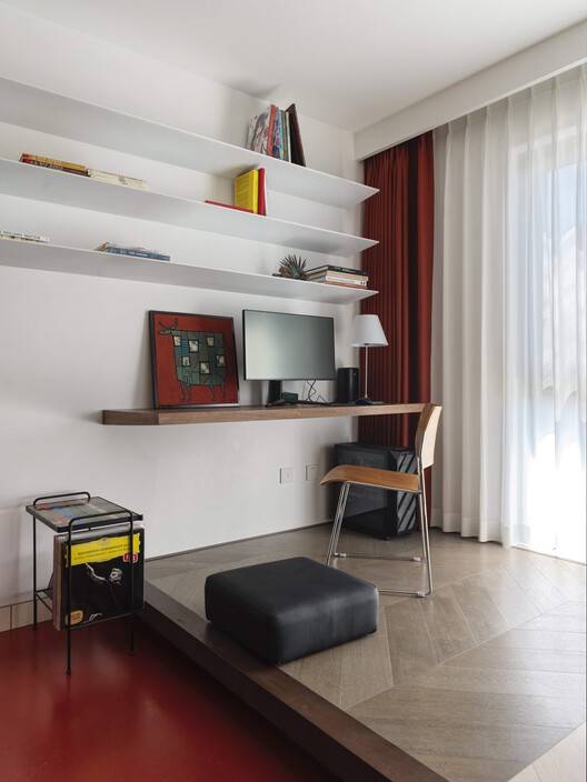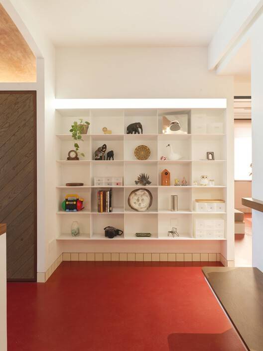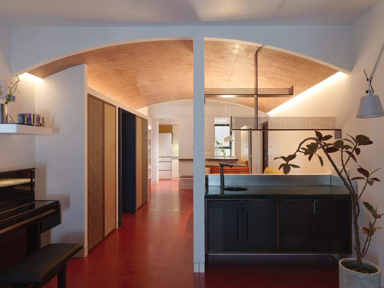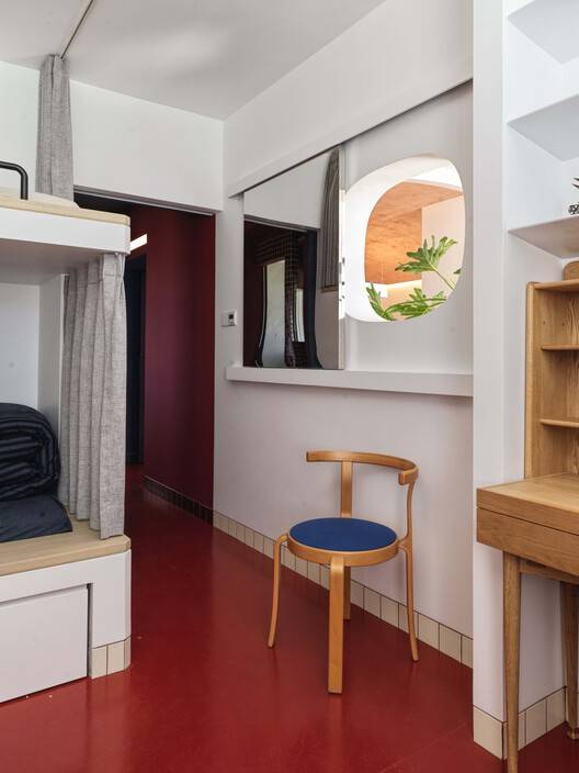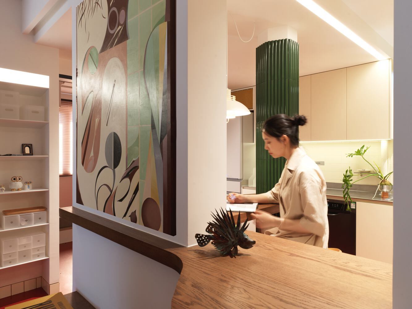 We made some bold attempts in terms of color. The floor is a red linen carpet sprinkled with gold, the curved tiles outside the hexagonal pillars of the kitchen are green, the dome is golden yellow, the coffee table on the south side of the family room is made of green marble, and the curtains are crimson. The blue double door facing the card seat leads to two bedrooms, which is the same size and shape as the lockers on both sides, bringing about dramatic space conversion. In this short corridor space, I used a large area of deep red and plain, including the tiles and baseboards in the washroom, and borrowed light from the frosted glass doors and cabinets in the bathroom and the gaps between the ceiling. When I closed it all around, I immediately found myself in an abstract painting. In this way, the narrow and dim negative space gained a sense of territory.