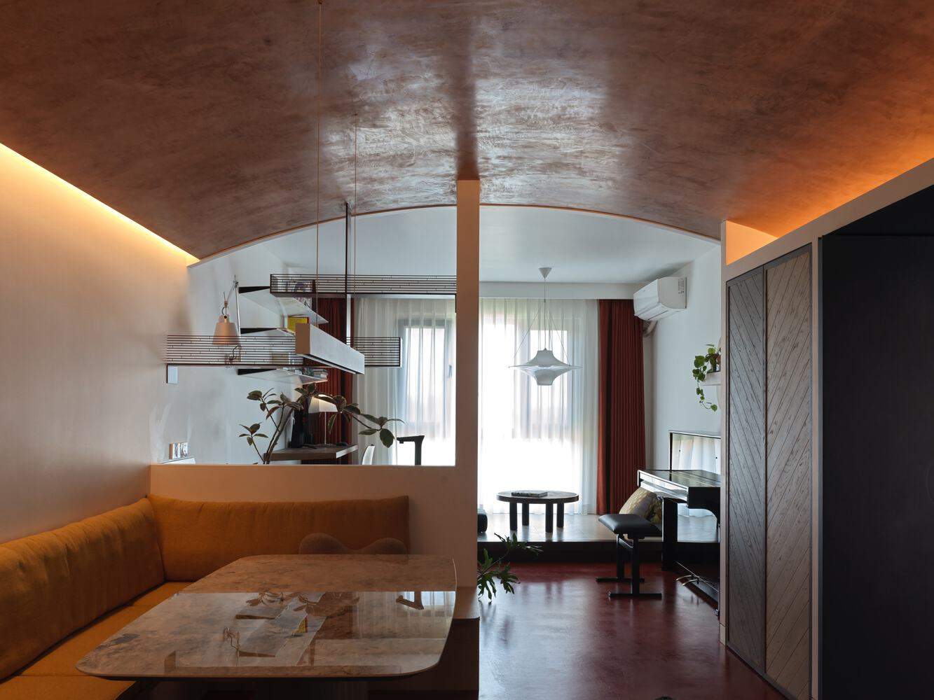 空间布局的巧妙应对:面对狭长且采光不足的户型,设计师展现了卓越的空间规划能力。通过将长厅一分为三,巧妙地解决了空间采光和功能划分的难题。入口处作为玄关过渡,中部利用拱顶和卡座打造多功能家庭室,南端设置活动区,满足了不同家庭成员的需求。这种布局不仅最大化地利用了空间,更重要的是,它打破了传统单一的空间模式,营造了丰富多样的生活场景,使得每个区域都充满了活力。特别是主卧高低床的设计,既是对业主独特生活方式的尊重,也是对居住空间情感内涵的升华。
