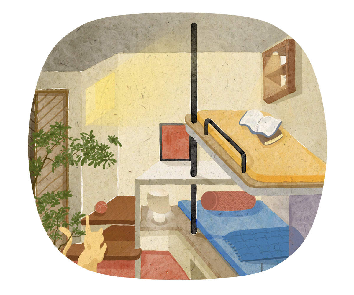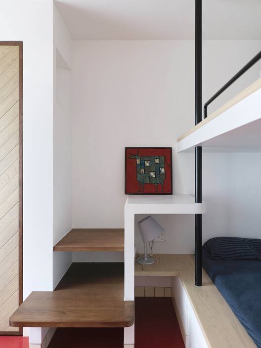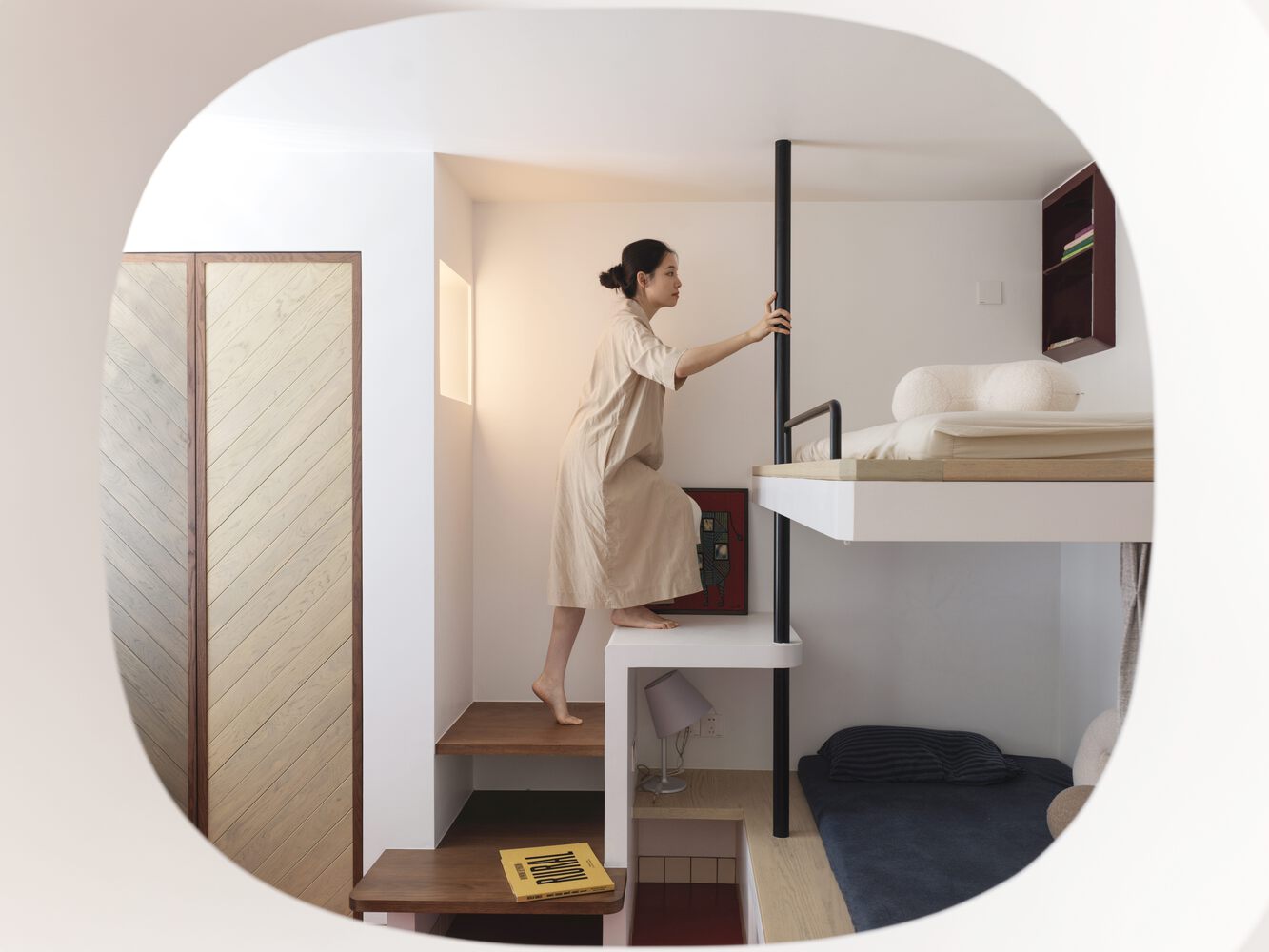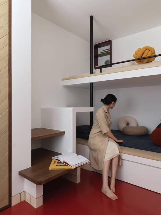 最独特的要求,是关于主卧的房间布置。业主想要两个大孩子一样的高低床。“刚结婚的时候住在一个 45 平米的开间里,两个人都是独生子女,对各自的习惯是包容但不一定相溶的态度。所以那时起就一起住错落的高低床,两个人一起说说话,互相可以对望到。不用忍耐彼此不同的生活习惯,美好在于各自忙碌自己的小事情,但是总能相视一笑。”