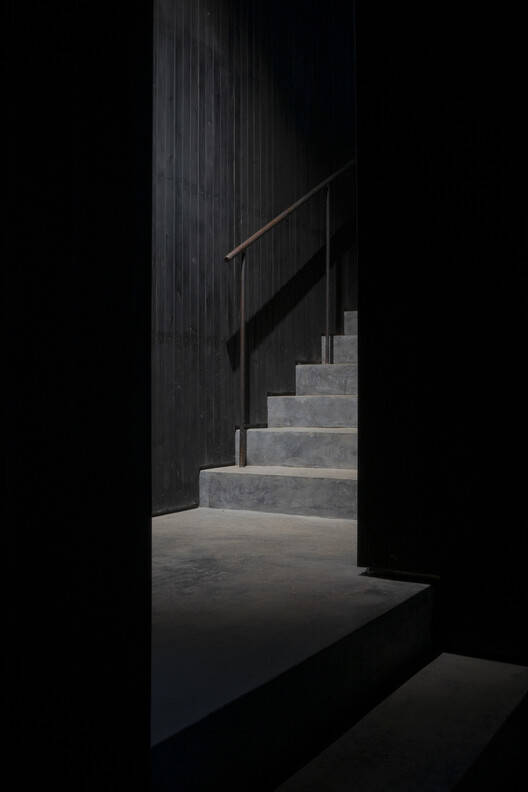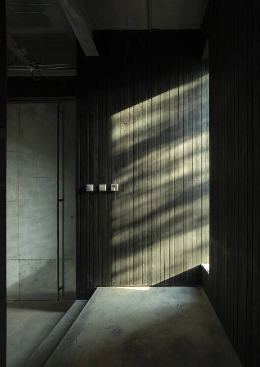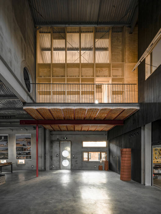 The internal spatial organization is driven by functional requirements, divided into three zones: exhibition, experimentation, and office. These are further grouped into two areas based on public accessibility: the exhibition space, occupying the entire southern volume on the ground floor, is designed to be regularly open to the public, acting as a deliberate indoor extension of the neighborhood's public realm. The relatively private experimentation and office spaces are distributed across the ground and upper levels of the northern volume. The double-height space, serving as a shared boundary between these two areas, naturally emerging as a pivotal spatial nexus in the design.