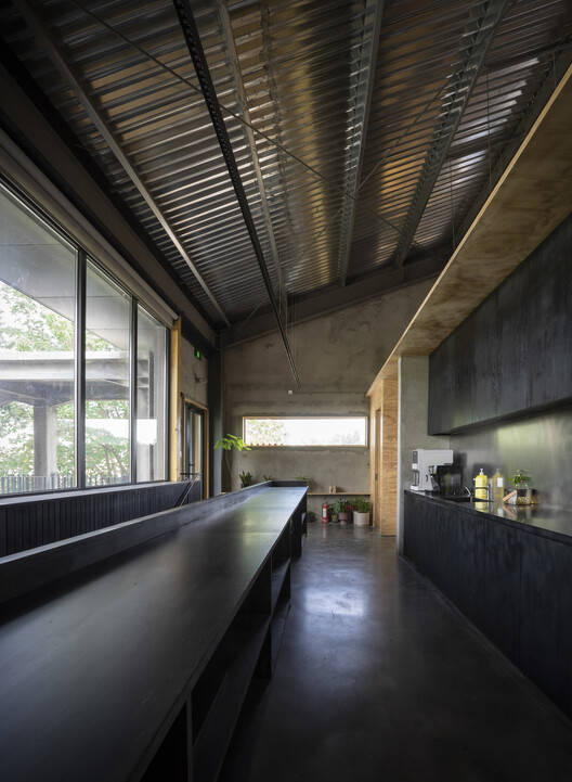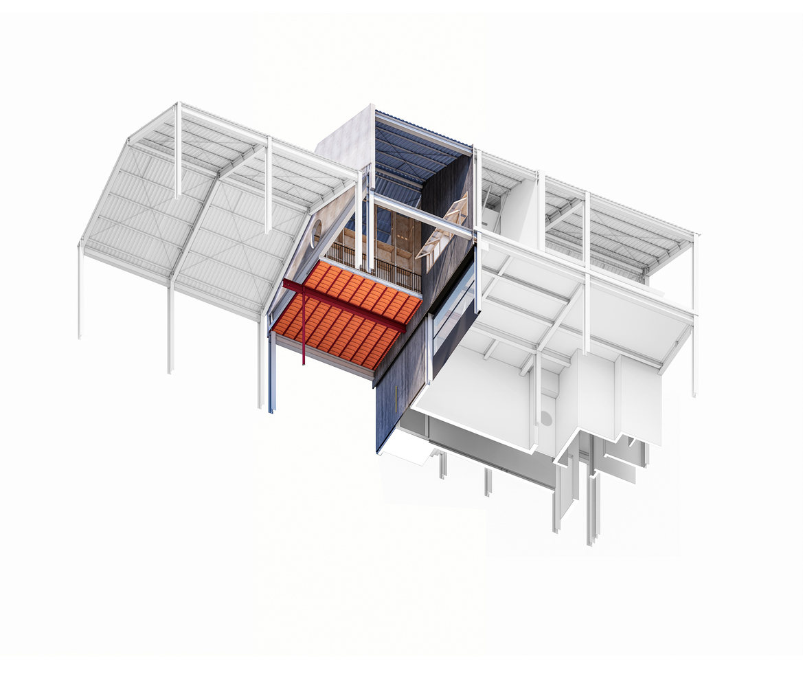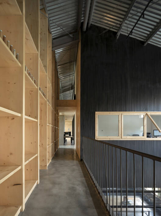 From the architect. The original building features a steel frame structure with a rectangular plan, elongated north-south and shorter east-west. It is composed of two immediately adjacent volumes of differing heights: The lower southern volume is a single-story, forming a large, undivided space, while the taller northern volume spans two stories, incorporating a 9-meter-high double-height space at its junction with the lower volume.