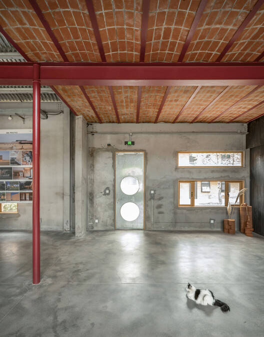 Within these low-tech strategies, born from practical constraints, lay architect's habitual desire to embrace new challenges. Take the added meeting room floor slab, for example: we chose to construct it using a structural steel-ribbed brick vault (Catalan vault). Ten H-shaped steel beams (120x85mm), spaced 630mm apart, formed the skeleton, with red bricks laid in vaults between them, topped with a concrete infill. The history of brick vaulting is ancient, with a tradition in Northwest China of constructing "gu yao" ( Hoop kiln) vaulted cave dwellings using earth bricks. The entire new slab is supported by a large H-beam and a solid steel column (14cm diameter).