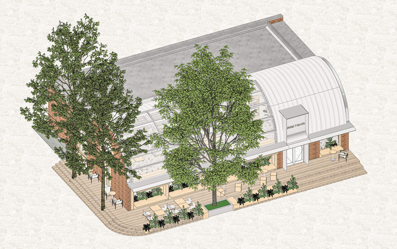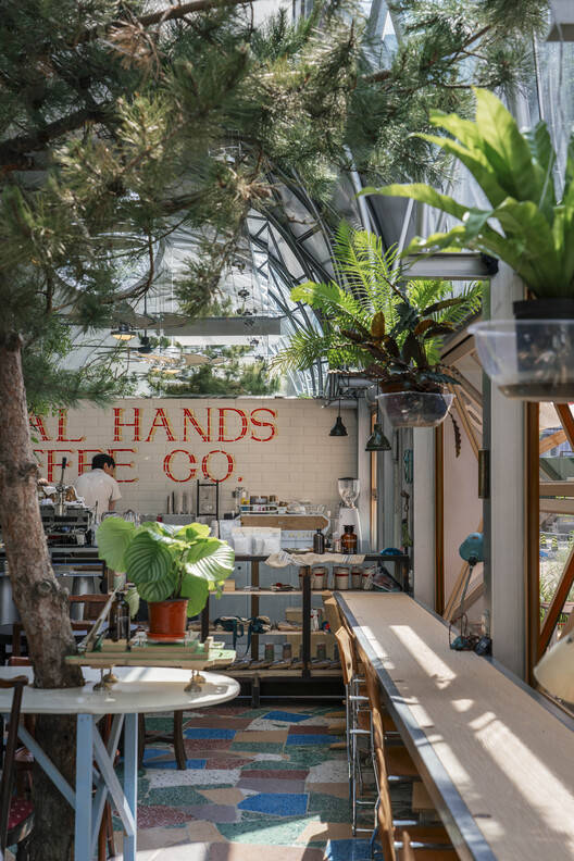 我们对商业的一个思考,在北京靠近国贸 CBD 这样的区域的小院子里,呈现什么样的建筑和室内效果,才能够和周围密布的连锁咖啡品牌、精品咖啡店竞争,把人不仅吸引来,而且可以待的住,停留下来,并愿意多次消费。所以我们提出了“在北京 CBD 盖大棚”这样一个颇具有行为艺术反差的想法,并将花园引入室内休息区域。