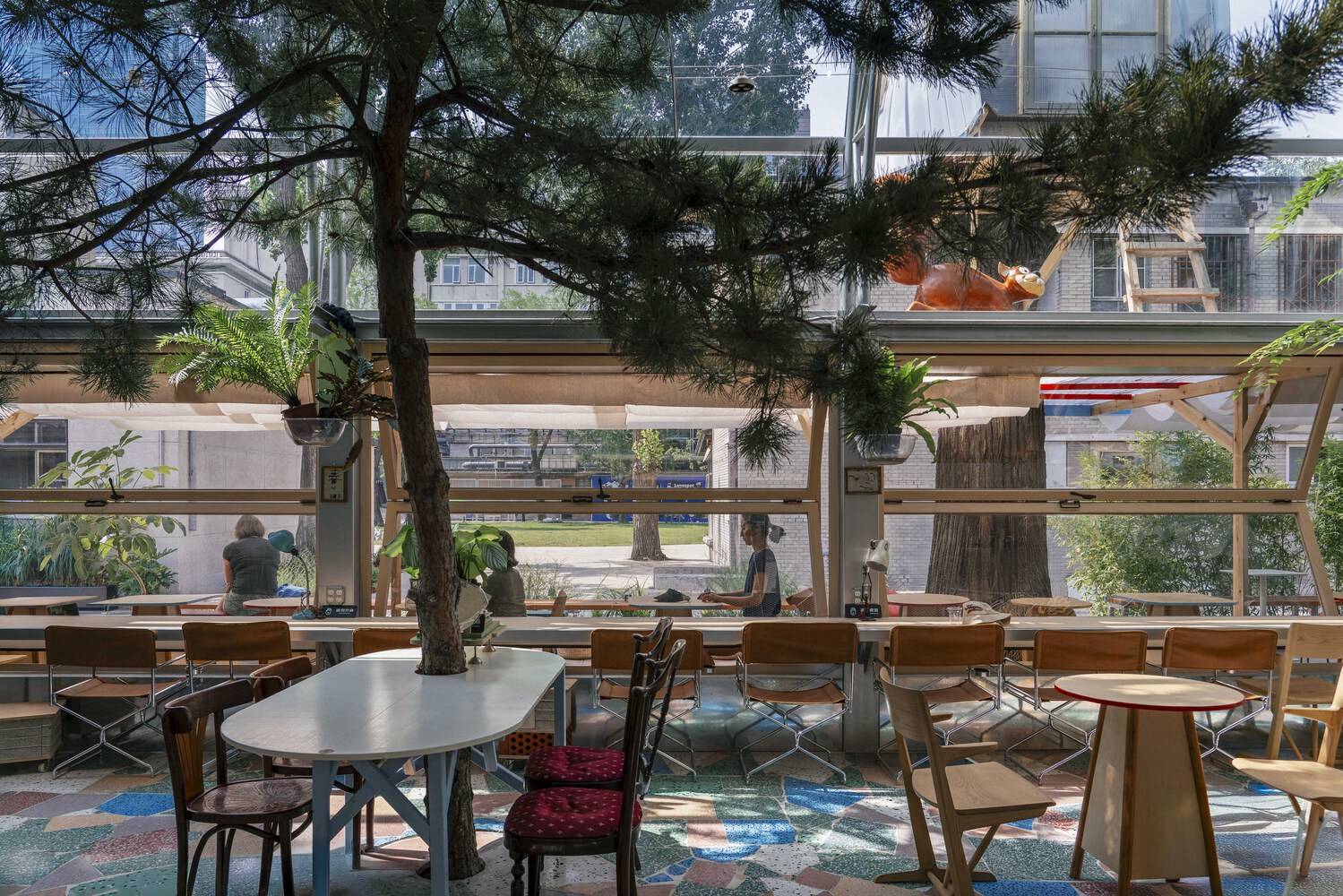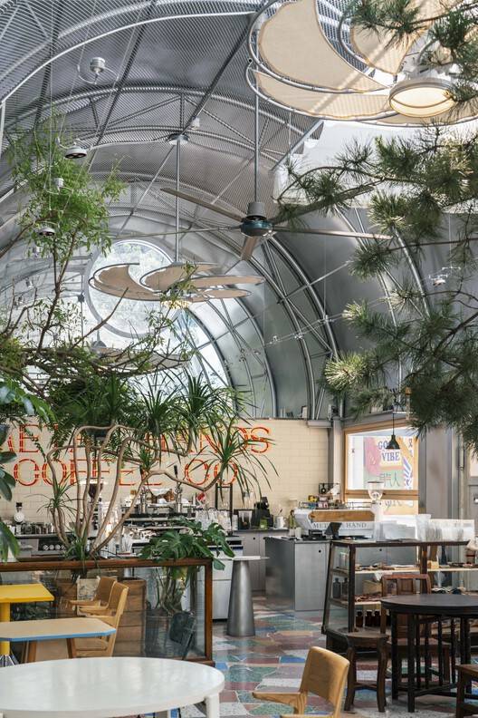 设计理念的创新与反差:该项目最引人注目的地方在于其设计理念的创新性。在竞争激烈的CBD环境中,设计师反其道而行之,提出了“在北京CBD盖大棚”的概念。这种具有行为艺术反差的设计手法,成功地抓住了人们的眼球。这种反差不仅体现在设计概念上,更体现在对场地特性的深刻理解和利用上。设计师将原本荒废的设备用房改造成一个充满生机与活力的咖啡店,这种转变本身就具有极高的创意价值。通过将花园引入室内休息区域,营造出一种独特的“树荫下的咖啡厅”场景,成功地构建了一个与周围环境形成鲜明对比的特色空间,吸引顾客并延长停留时间。