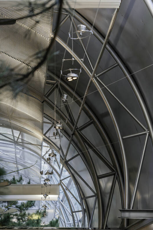 细节处理的匠心与实用性:除了设计理念和空间氛围的营造,项目在细节处理上也展现了建筑师的匠心独运。针对“玻璃大棚”可能带来的夏季过热问题,设计师从结构遮阳、张拉网滤光等方面着手,巧妙地解决了这一问题,体现了设计师在实用性方面的考虑。这些细节处理不仅提升了项目的舒适度和使用体验,也展现了设计师对技术和材料的精准把握。例如,通过缩减玻璃面积、保留与树冠交错部分,以及铺设铝张拉网等手段,有效地控制了光照和温度,使空间既能最大限度地享受自然光线,又能保持舒适的室内环境。这种对细节的关注,使得项目更具可持续性和实用性,也更能满足现代人的生活需求。