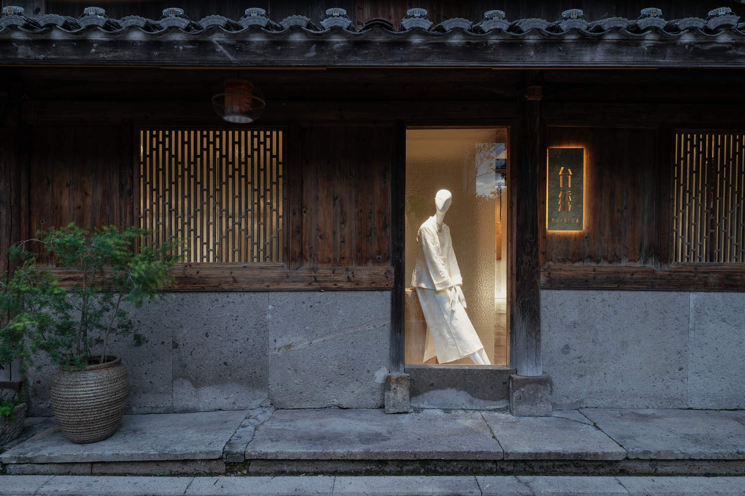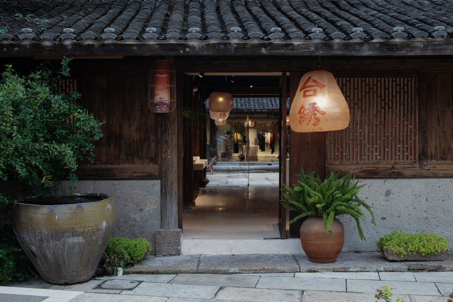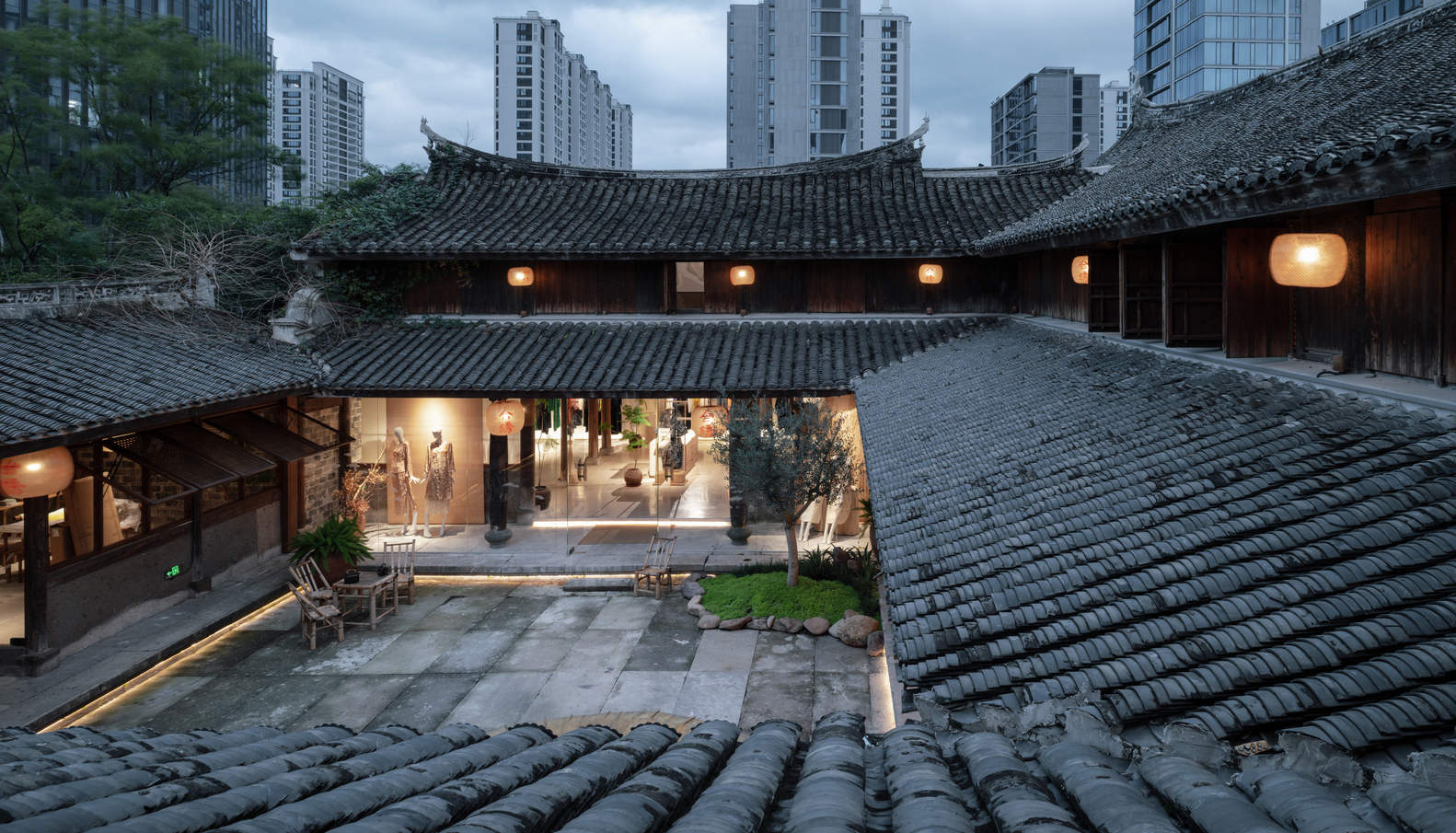 The south gate of the Tai Xiu Yuan faces the waterfront. As it serves as an important historical interface and frequent venue for activities, we have chosen to only develop a limited design for the south facade, replacing only the original wooden door and adding two sets of brass signs, making the traditional brick wall and stone carved doorway the main characters. Through the open door, the illuminated walls in the courtyard and hall still exhibit a visual attraction that converges inward. Similarly, the eastern facade only replaces a small number of original wooden doors with glass doors, facing the main street to improve accessibility; Partial display windows have been set up on the west facade, allowing visitors to catch a glimpse of the clothing products displayed in the commercial space along the street of Tai Xiu Yuan.
