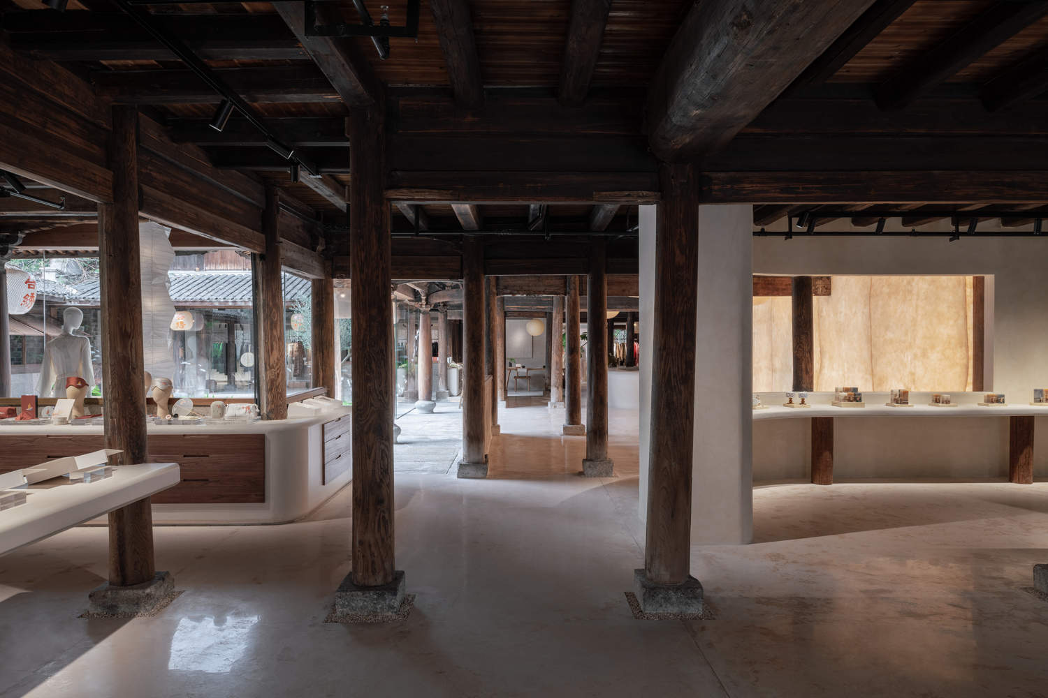 入口处两厢门房被改造为氛围独到的茶室。庭院东西北三方位的原本的木门与窗扇被拆除只留下石头墙板,檐廊被玻璃幕墙围入,成为室内与的通行与展示空间,室内空间因此向庭院外扩与延展。为了创造新的地坪界面和增加净高,室内原本的石板地面被拆除,浇筑混凝土后以细颗粒的米色水磨石作为最终的完成面,部分石板也被利用回填至庭院与檐廊中部分因年久失修而损坏开裂的石板地面。