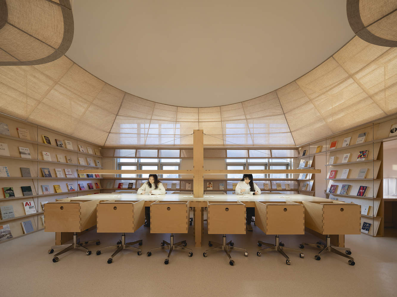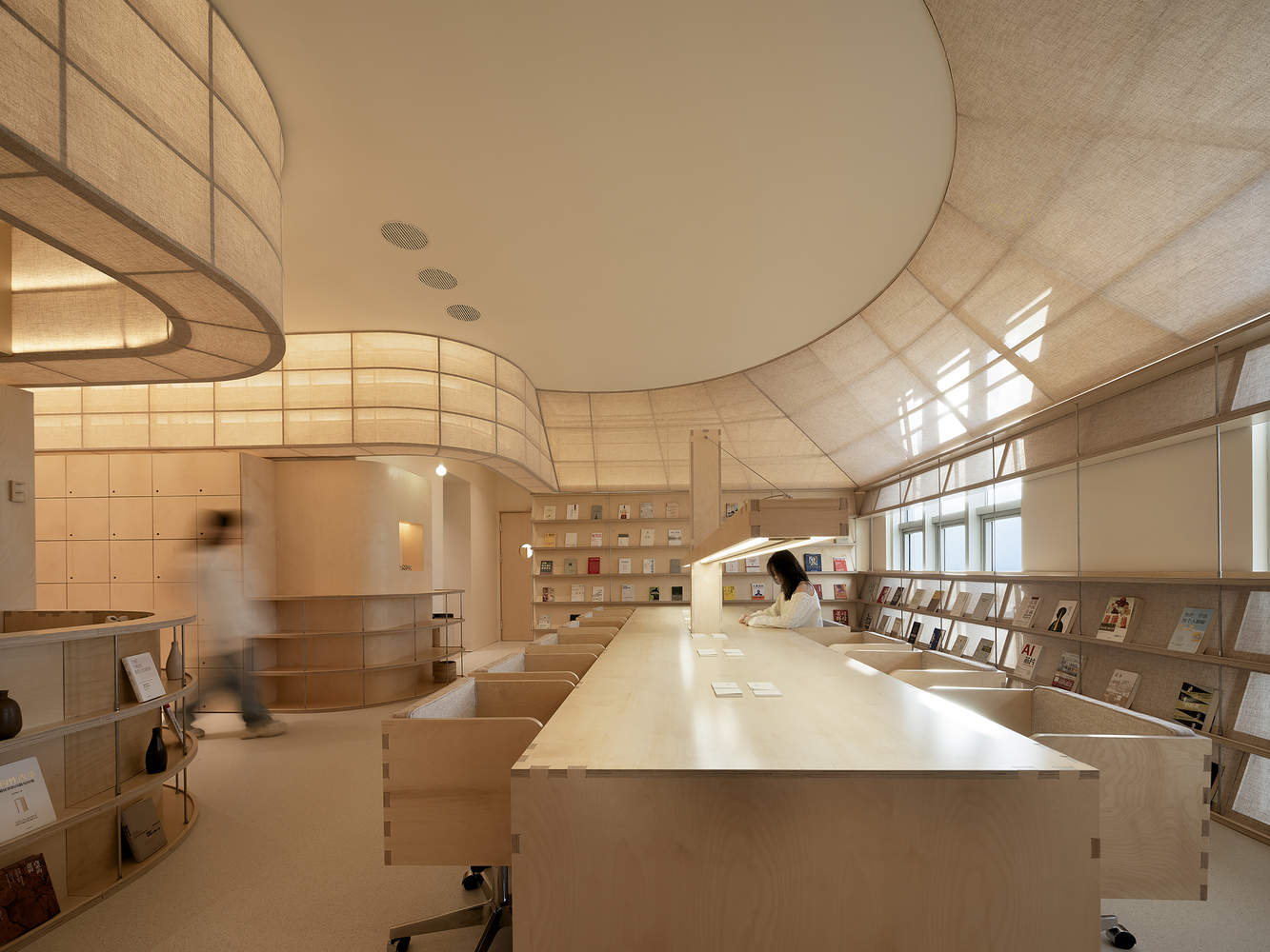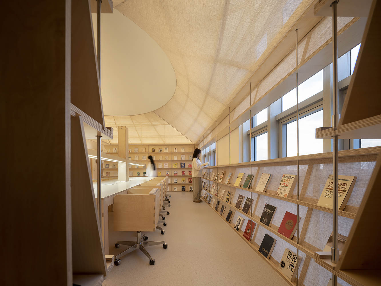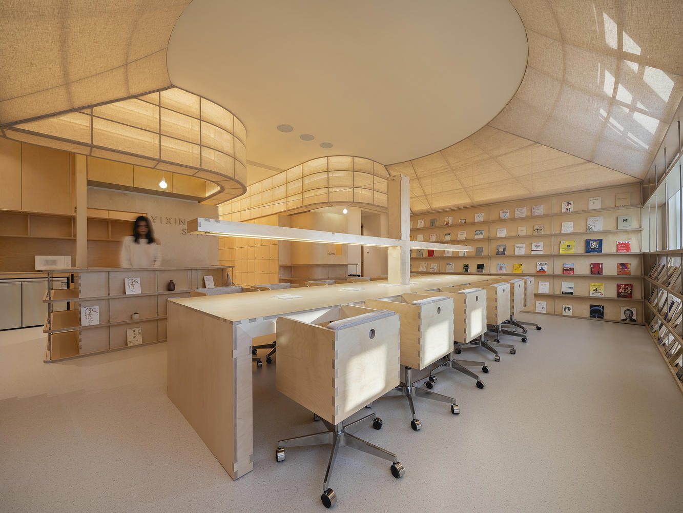 空间叙事与光影的巧妙融合:“壹心空间自习室”最令人印象深刻的是其对光线的运用。设计者巧妙地利用桦木、织物和灯光,营造出一种既实用又充满诗意的氛围。悬浮的灯笼装置,不仅仅是照明设备,更像是空间的精神图腾,通过光线的穿透和漫射,创造出丰富的光影层次。白天,阳光穿透织物与木框架,在书桌上投射出灵动而诗意的光影;夜晚,柔和的灯光透过半透纱幔,营造出梦幻般的氛围。这种对光线的精妙控制,赋予了空间生命力,使得学习空间不再单调,而是充满了变化和趣味,与城市中的学习需求完美契合。