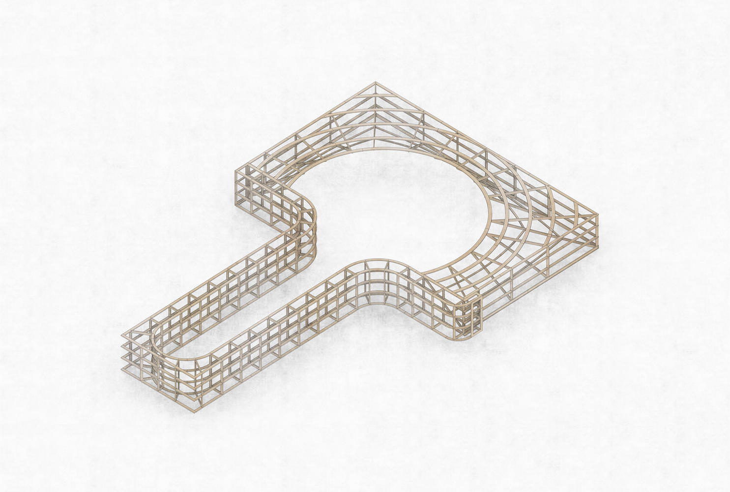 一盏悬浮的灯笼意向装置仿佛空间的精神图腾,安静的盘旋在空中。桦木多层板经数字化设计,构建出精细的榫卯细部,其木质骨骼隐于布料之后,若隐若现,当光线穿透时有了呼吸的节奏。白天,日光温柔地穿过布料与木骨架的间隙,在书桌上投射出层次丰富的光影,灵动而诗意。夜晚,温暖的灯光透过半透纱幔,在顶部晕染出一片柔和的微光,仿佛漂浮的梦境。这个悬浮的发光装置不仅是功能性的照明系统,更是空间的精神象征,其投影随着太阳角度在 12 小时内完成从实到虚的形态渐变。