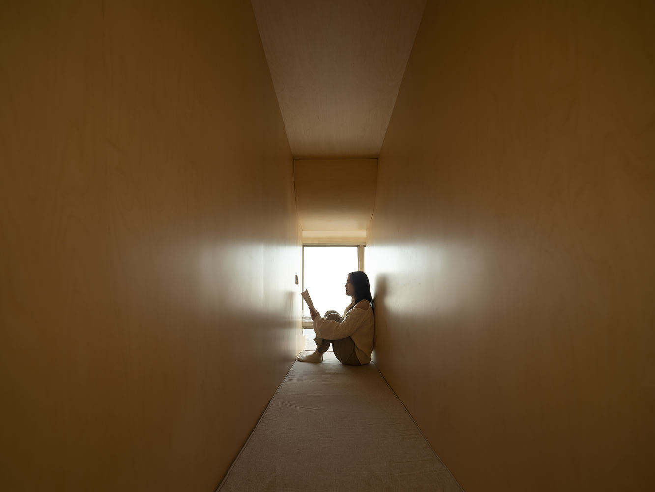 In terms of vertical design, we have designed an interesting climbing path, selecting areas with fewer obstacles at the top of the space and placing them in a stacked functional area. Multiple three-dimensional boxes have been interspersed in the self-study area, increasing the usage area and adding an interesting spatial experience.. Following the ladder upwards, one arrives at the spiritual space - the meditation hut. This cabin space combines lying and sitting functions, with a transparent hidden table at the end, allowing users to overlook the city skyline from a height of 100 meters and experience the atmosphere of overlooking mountains and small places.