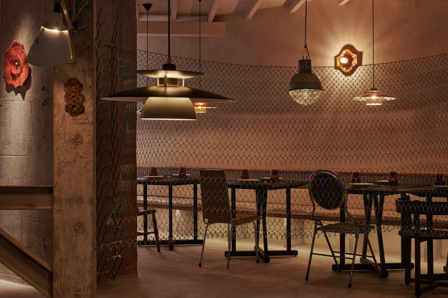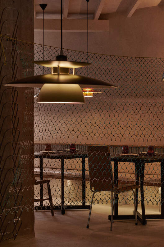 文化元素的巧妙融入: 项目在空间设计中融入了丰富的地域文化元素,将泉州地方特色巧妙地融入到杭州的商业空间中。设计师将传统的渔网元素重新演绎,作为墙面装饰和门帘,这种设计手法既保留了闽南地区的文化符号,又赋予了空间独特的视觉特征。 这种设计不仅体现了对当地文化的尊重,也为顾客创造了独特的文化体验。更重要的是,它将商业空间与文化记忆联系起来,使餐厅不再仅仅是就餐的场所,更成为了一个承载文化、传递情感的空间,让顾客在享受美食的同时,也能感受到浓厚的文化氛围,增强了场所的独特性和吸引力。