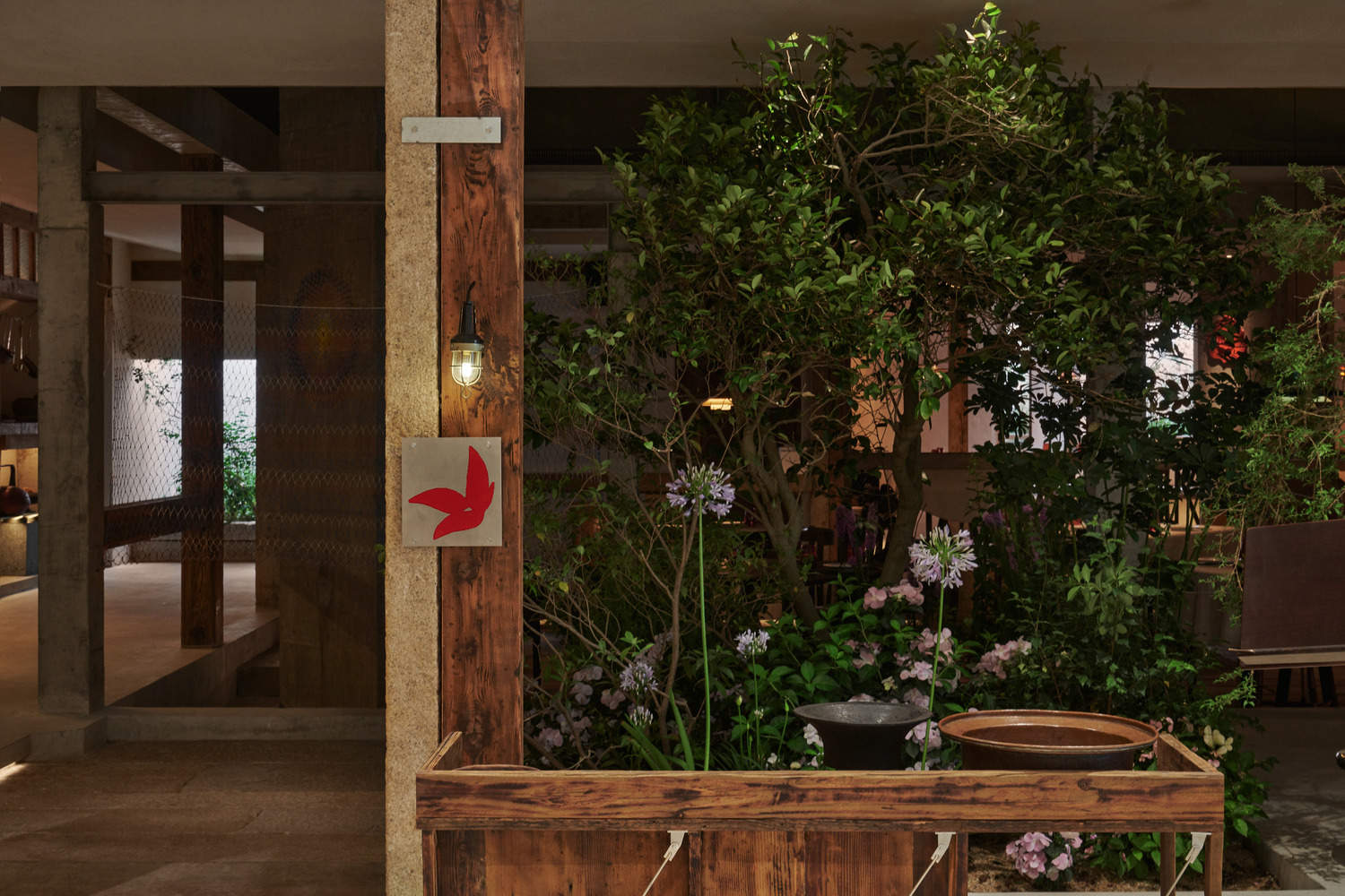 空间融合与材质运用: 项目的核心在于对原有建筑结构的巧妙保留与重新诠释。设计师没有选择完全推翻重建,而是选择“退化”的设计理念,将混凝土、原木与植物等天然材料巧妙融合,在保留原有建筑质感的同时,注入了鲜活的生命力。这种设计手法在现代商业空间中尤为少见,它不仅节约了成本,更体现了对历史的尊重和对环境的友好。 材质的运用也值得称道,混凝土的粗犷、原木的温暖、植物的生机,共同营造出一种质朴而又富有层次的空间氛围,体现了设计师对材料的深刻理解和对细节的极致追求,创造了独特的视觉和感官体验。