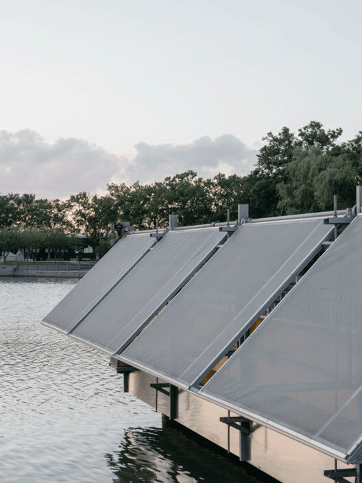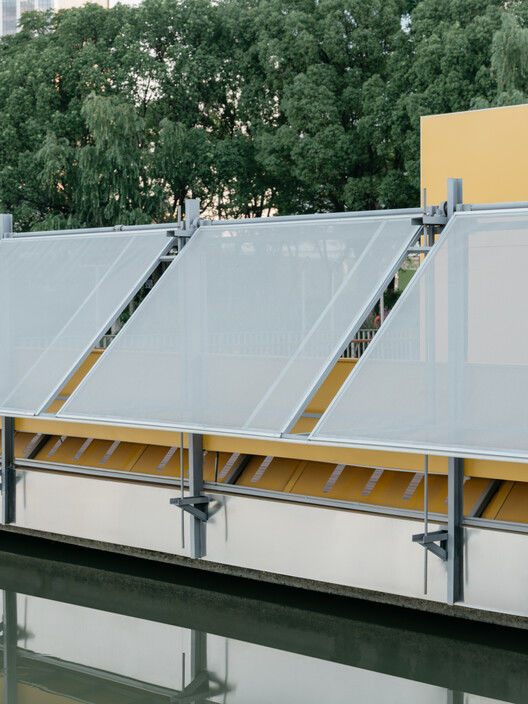 可持续理念的实践:在建筑结构与材料的选择上,该项目也展现了对可持续发展理念的深刻理解。采用轻钢结构体系,外覆铝板,地面铺设竹木材料,最大程度地减少了对原有平台的干扰。这种“稳固骨架+可变表皮”的建构策略,延长了建筑的生命周期,赋予其在城市环境中持续适应的能力。此外,设计中对可变界面的运用,也使得建筑能够应对不同的季节、光照条件和运营场景。这种轻盈、灵活的设计策略,不仅降低了建筑的维护成本,也使得建筑能够更好地融入环境,实现与自然的和谐共生,体现了设计师对建筑可持续发展的思考和实践。