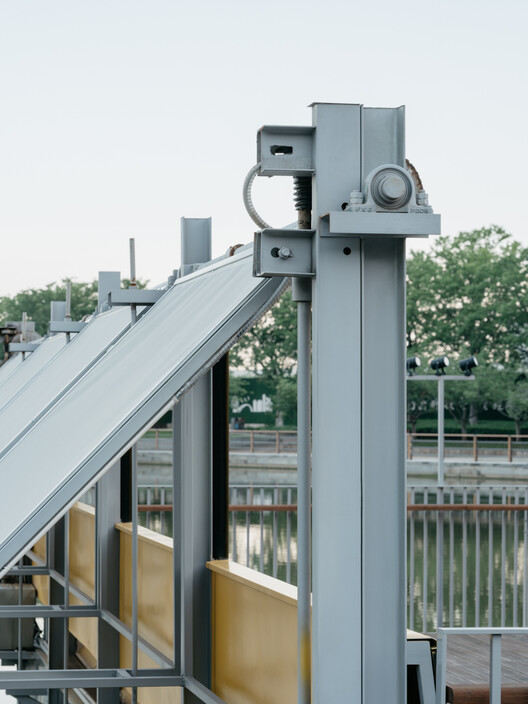 为了尽量减少对原有平台的干扰,项目采用轻钢结构体系,外覆铝板,地面铺设竹木材料。主体结构为不可拆卸的整体固定式构造,以确保长期的稳定性与耐久性;与此同时,外立面可开合、可调整的界面系统使其能够在不同的运营场景、季节变化及光照条件下呈现多样化状态。这种“稳固的骨架 + 可变的表皮”的建构策略,不仅延长了建筑的生命周期,也赋予其在城市环境中持续适应与回应的能力。我们希望它不仅是一个功能空间,更是一种可以被持续使用、不断激活的空间框架。