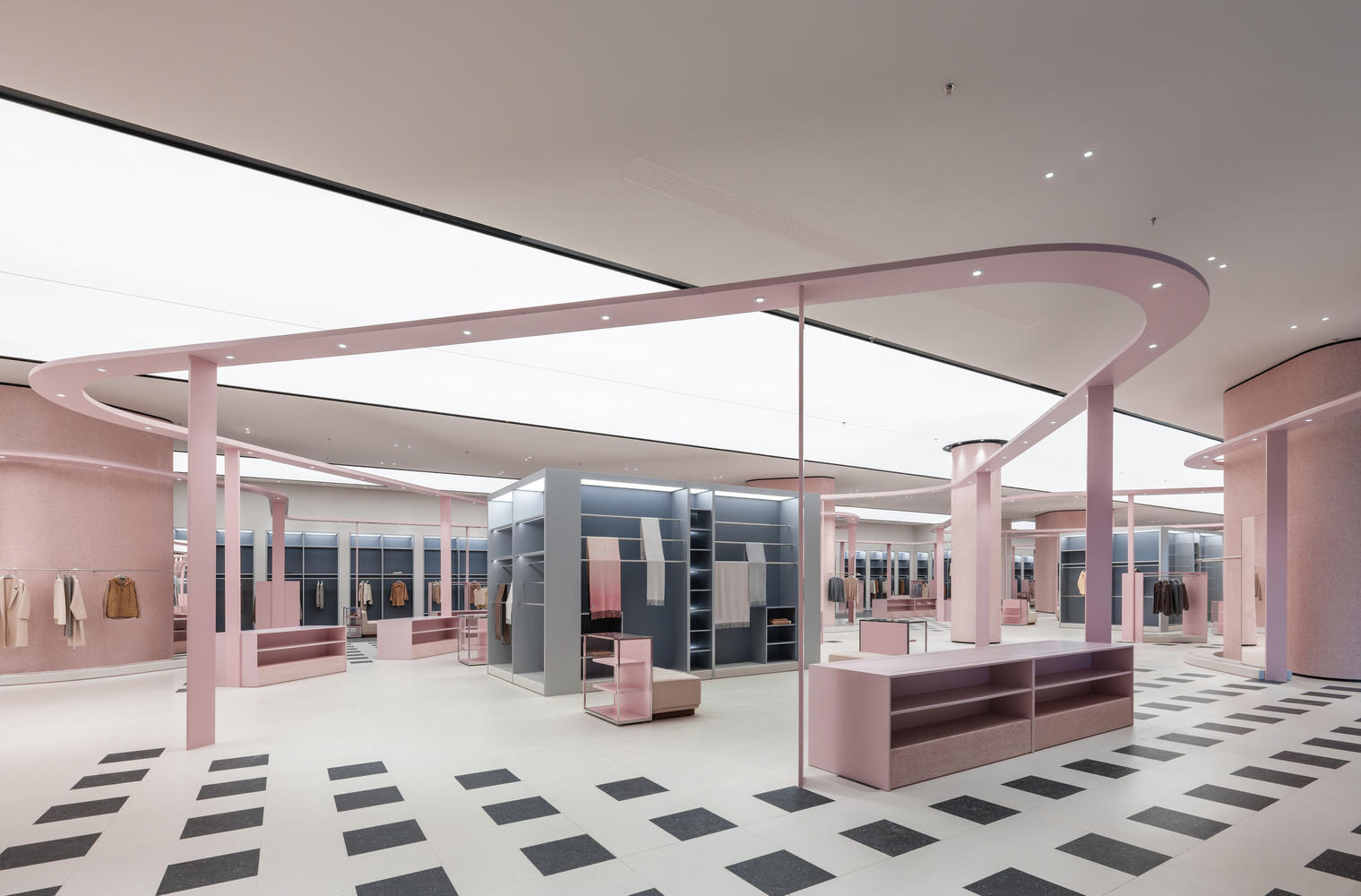 作为品牌目前最大的单层零售空间,该店预计在高峰期每日可接待超过 700 名顾客,展示超过 4000 件商品,涵盖五大品牌系列。动线设计成为关键:平面布局以四个中央岛台为核心,使购物过程既可以形成连续的循环体验,也可以通过相互连接的 “8” 字形路径完成。