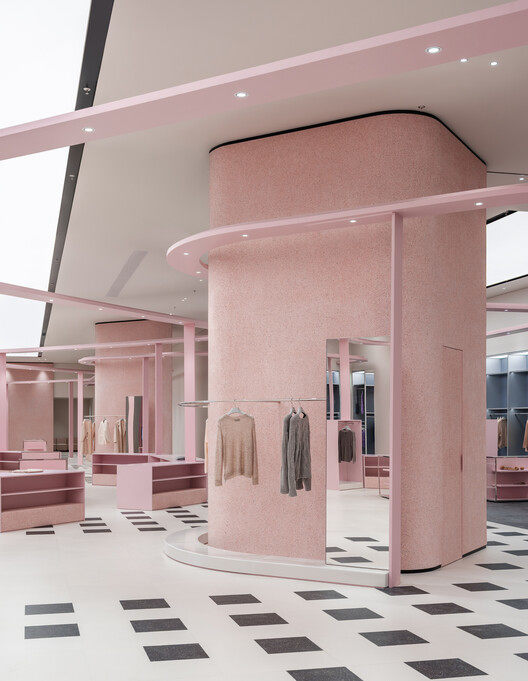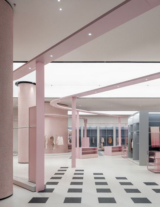 设计中粉色调的环境柔化了空间氛围。这些色彩的搭配产生出微妙的光学振动,让空间显得更加轻盈、富有趣味。特意挑选的颜色旨在传递欢乐与愉快的感受。通过强调高光色调,同时让色彩自然交融,确保了服装始终成为视觉的焦点。