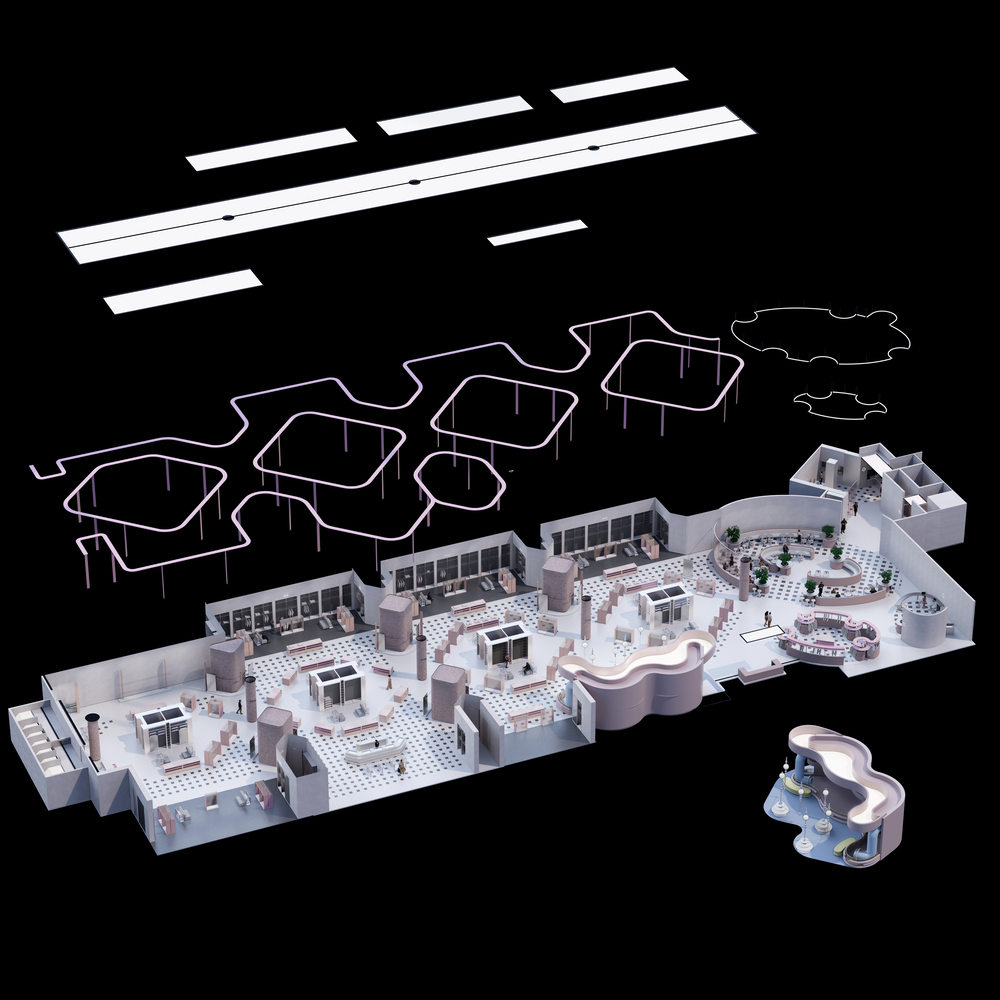 在儿童展区内,游乐设施与服装展示完美结合,呼应了商店的整体设计理念。特色吊灯既作为装饰,也充当衣物挂架;扭曲流动的“巴瑞索膜”天花与简洁的几何灯光形成鲜明对比。部分管状结构被设计为可攀爬装置,让空间在视觉和体验上都充满趣味。