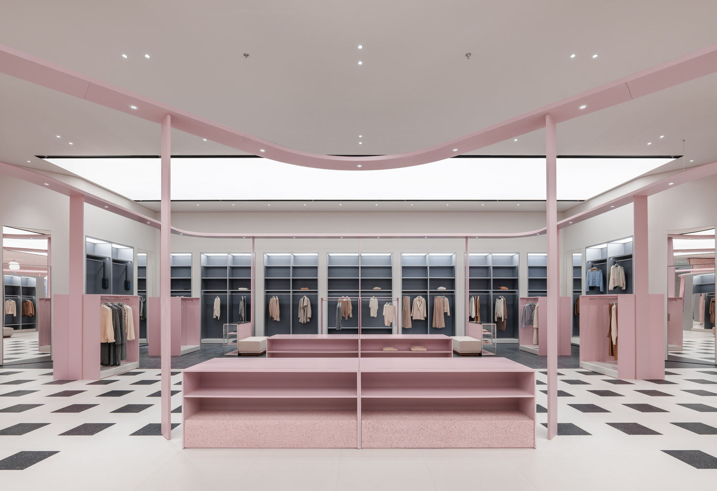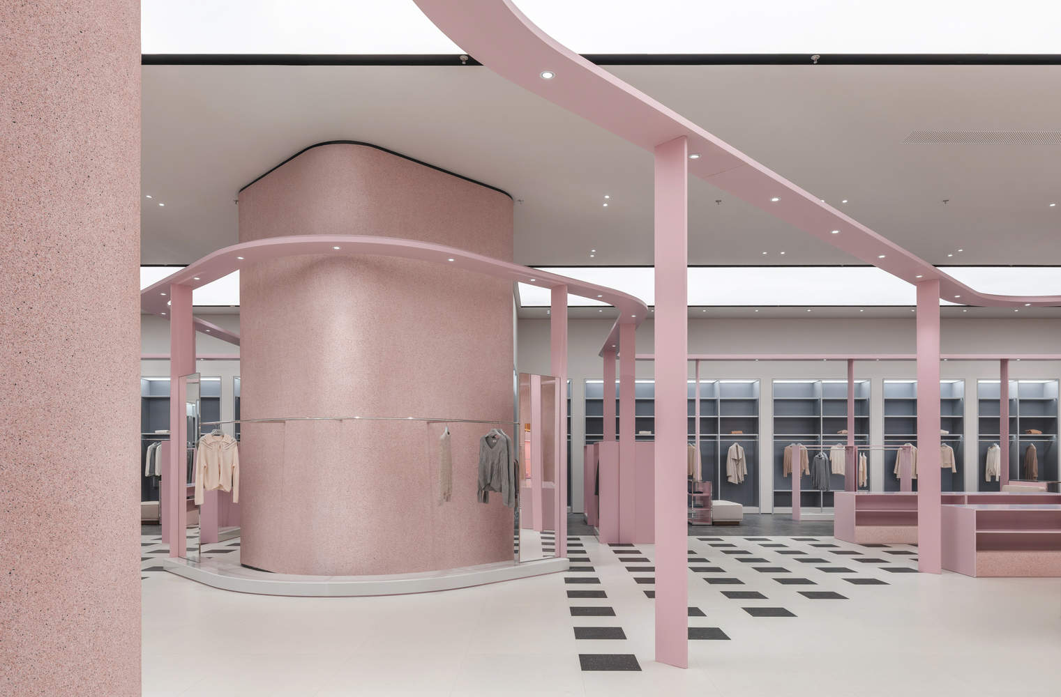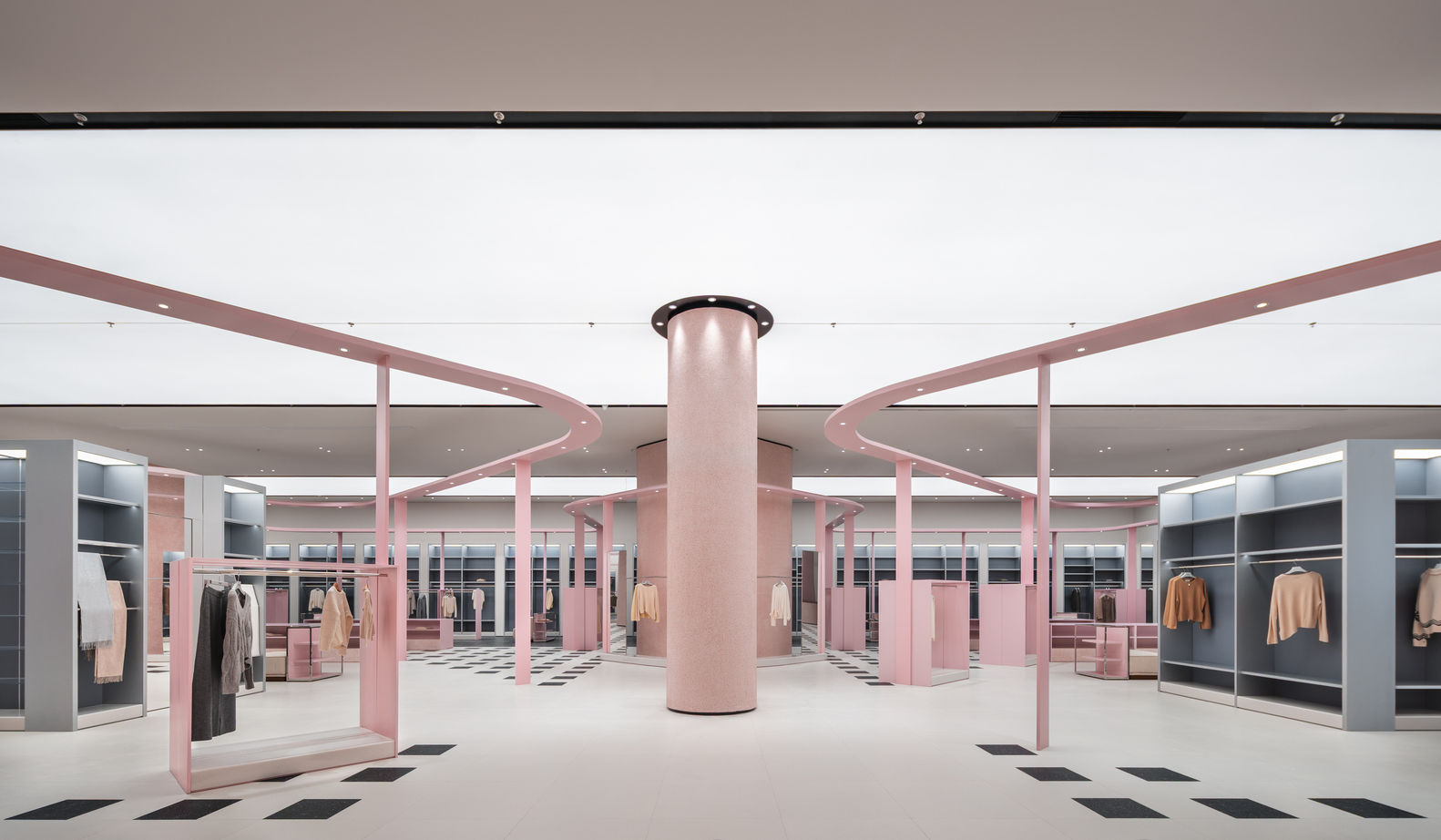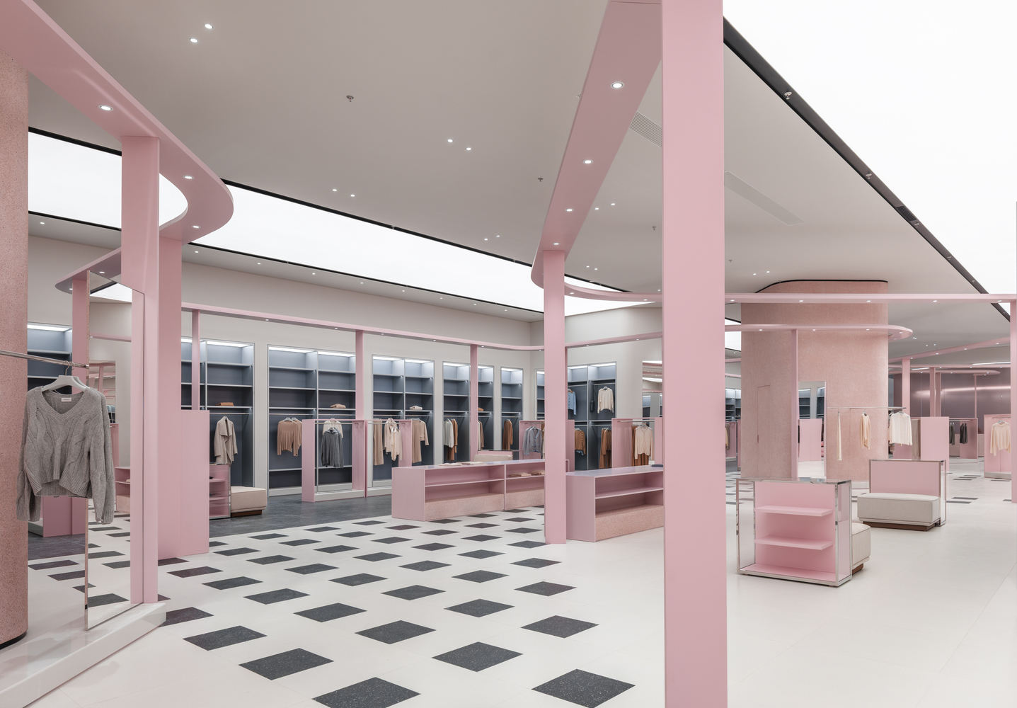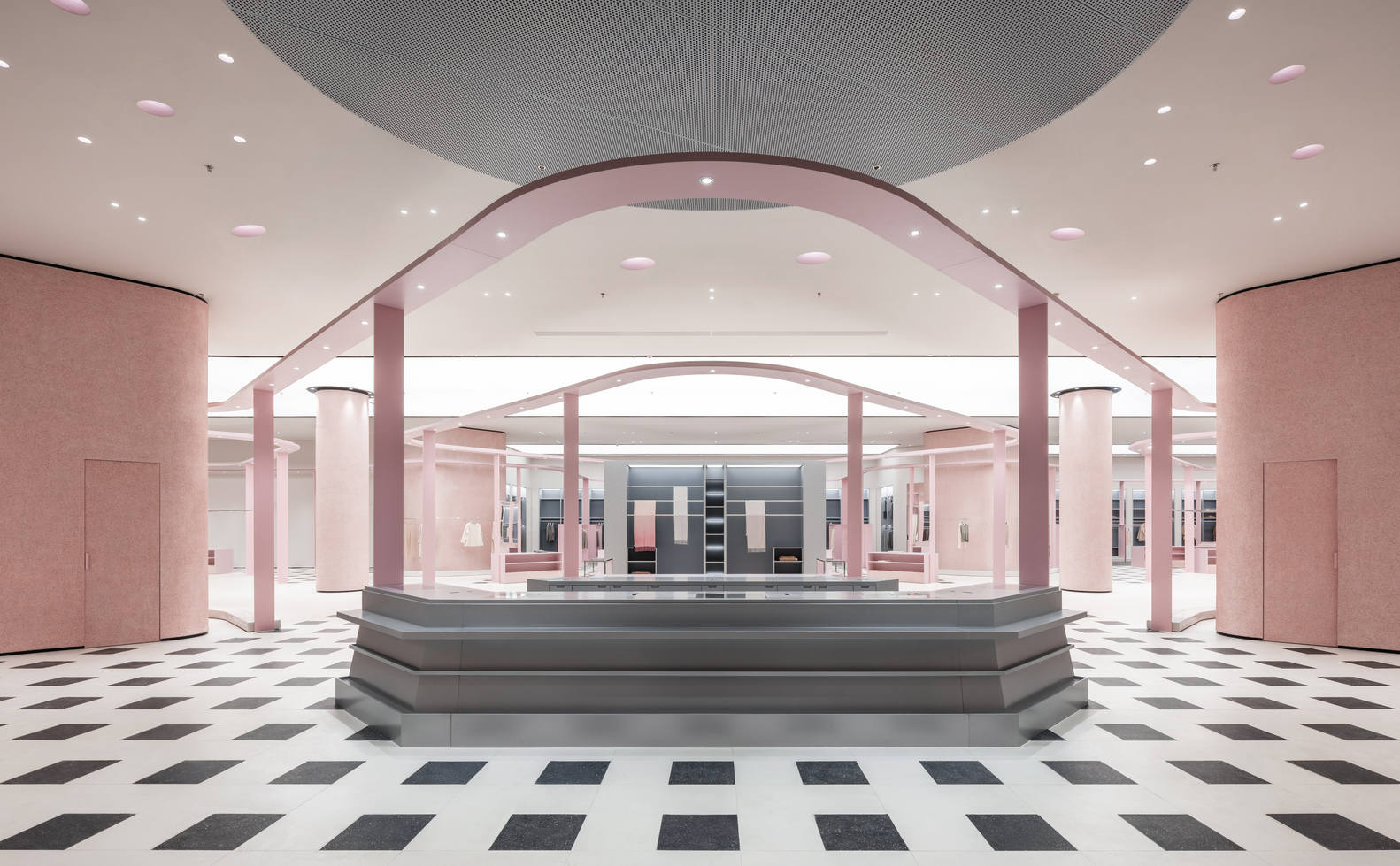 The pink toned environment in the design softens the spatial atmosphere. The combination of these colors creates subtle optical vibrations, making the space appear lighter and more interesting. The specially selected colors are intended to convey a sense of joy and happiness. By emphasizing highlight tones and allowing colors to blend naturally, clothing always remains the visual focal point.