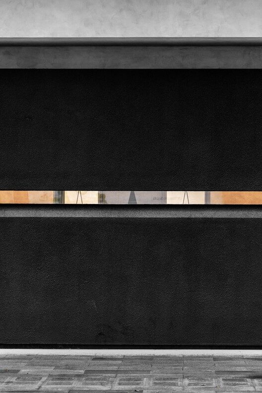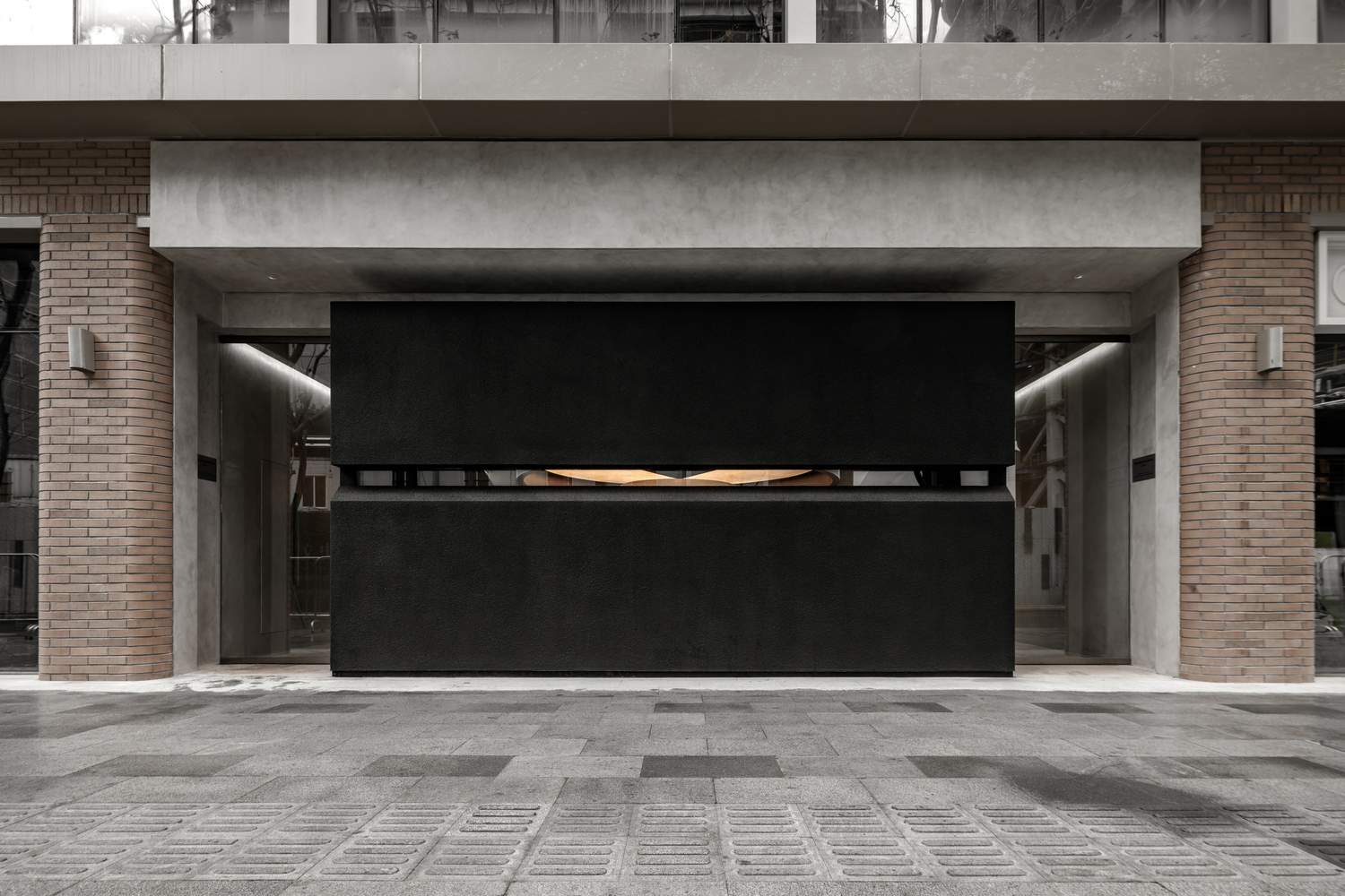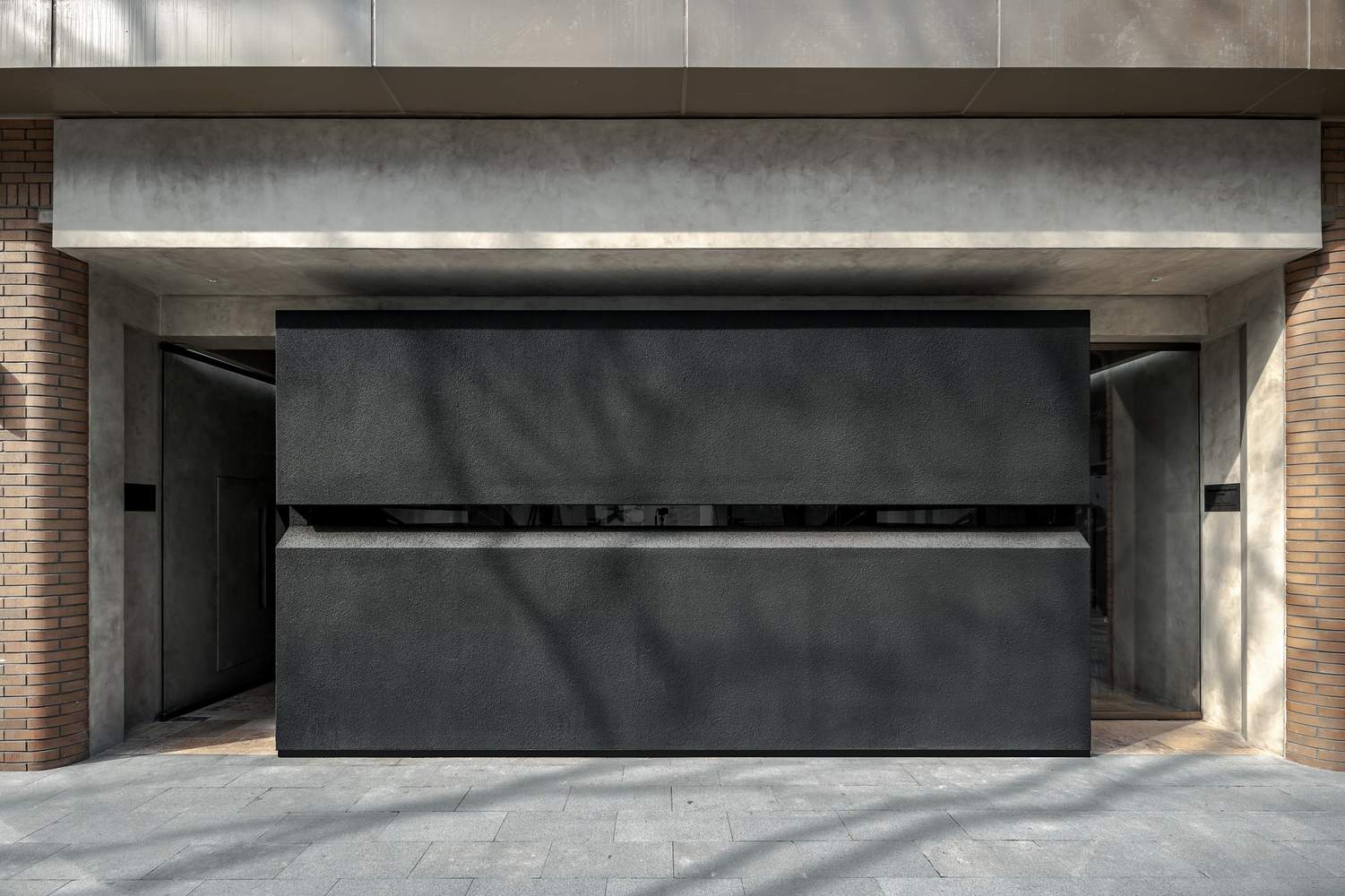 临街而立,一块克制而厚重的黑色体块,如深沉岩石般嵌入街景,与环境形成清晰界限。它犹如一面“默室”之墙,仅留一线缝隙,容许有限的光线和视线内外流转。黑色体块带着无形的引力,吸引着过往行人,既是冷静的凝视,亦是隐秘的邀请。两侧的全高透明玻璃门作为唯一入口,被巧妙消隐于黑色体块之中,既确保了立面的绝对纯粹,也使“进入”这一行为,成为一种充满仪式感的主动选择。