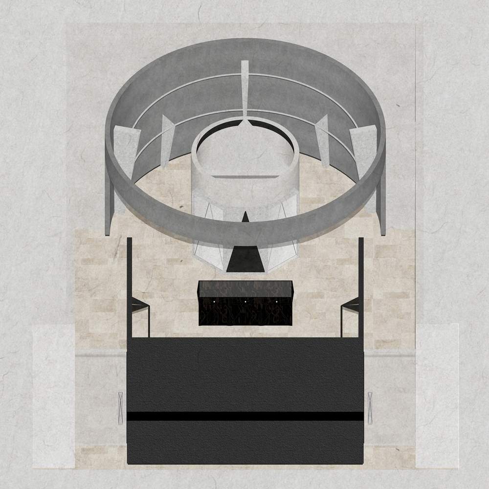 Entering the room, external disturbances are quickly isolated, and visitors shift from being "watched" to "immersed". The pure space with a black and gray tone slowly unfolds, with completely symmetrical geometric axes and double U-shaped flow lines interwoven with circles and rectangles, creating a fully enclosed "room" experience. In the center of the space, circular structures are embedded with folded rectangular blocks, like the eyes of space, silently gazing at every visitor.