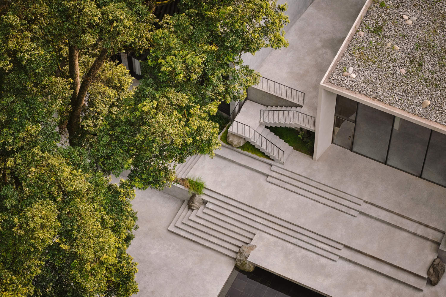 中央庭院是酒店的社交核心,一个向外延展的空间,在群山背景下让自然与建筑交汇。庭院中央矗立着一株古老的桢楠树,四周水池环绕。作为山谷中最古老、最高大的树木,它宛如无声的守护者,将体验锚定于历史与现代的延续之中。